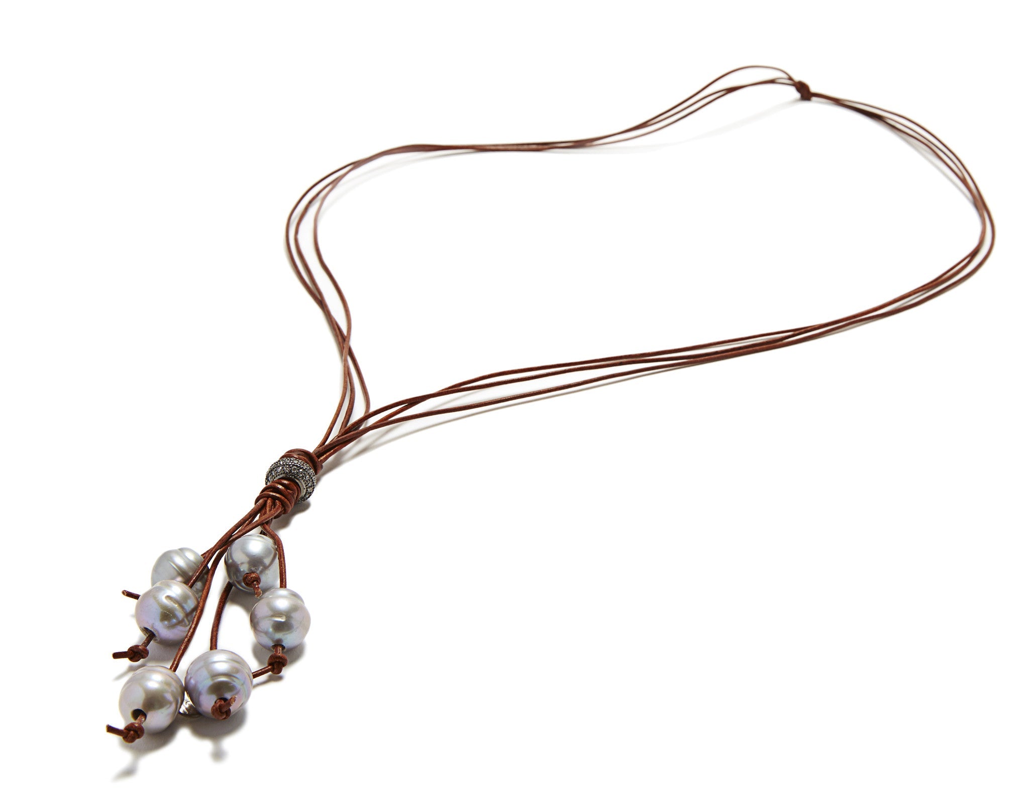 saddle colored leather with white wrinkle pearls and a cz finding set in oxidized silver