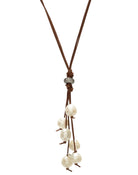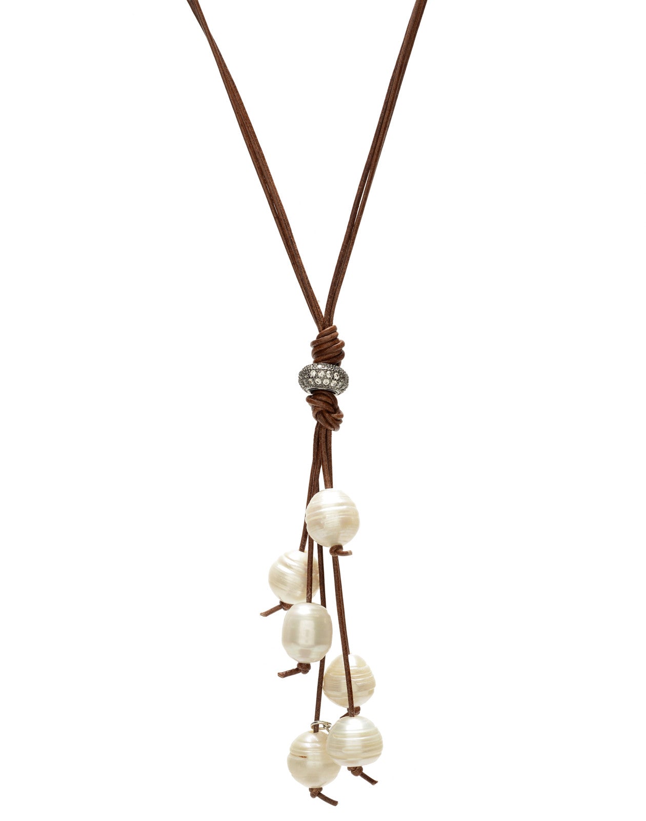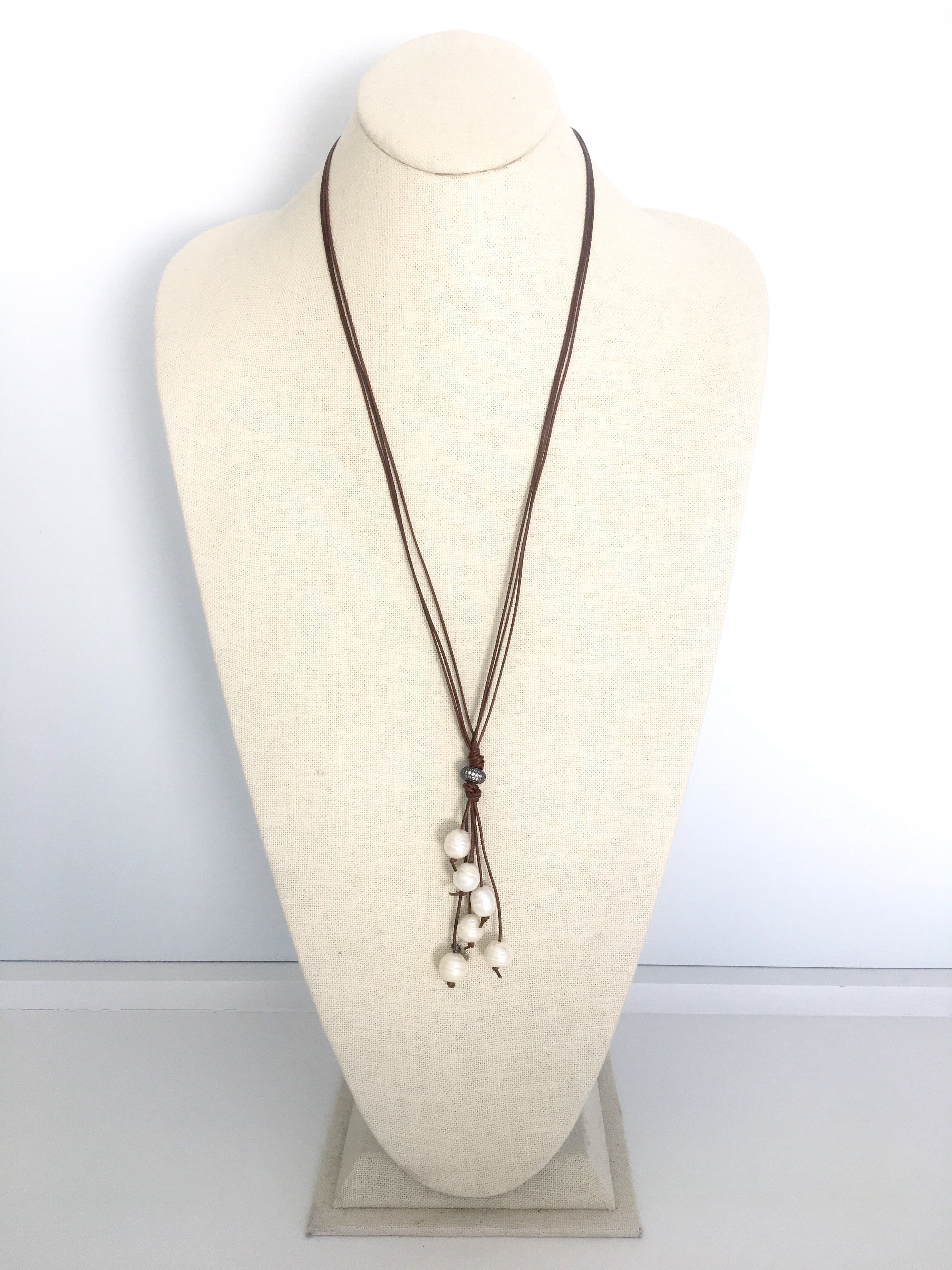 Beautiful long necklace in Greek leather with a stunning pearl cluster drop.