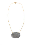 Pave diamonds set in oxidized silver with gold plating on back. Size of oval is 35mm x 50mm.