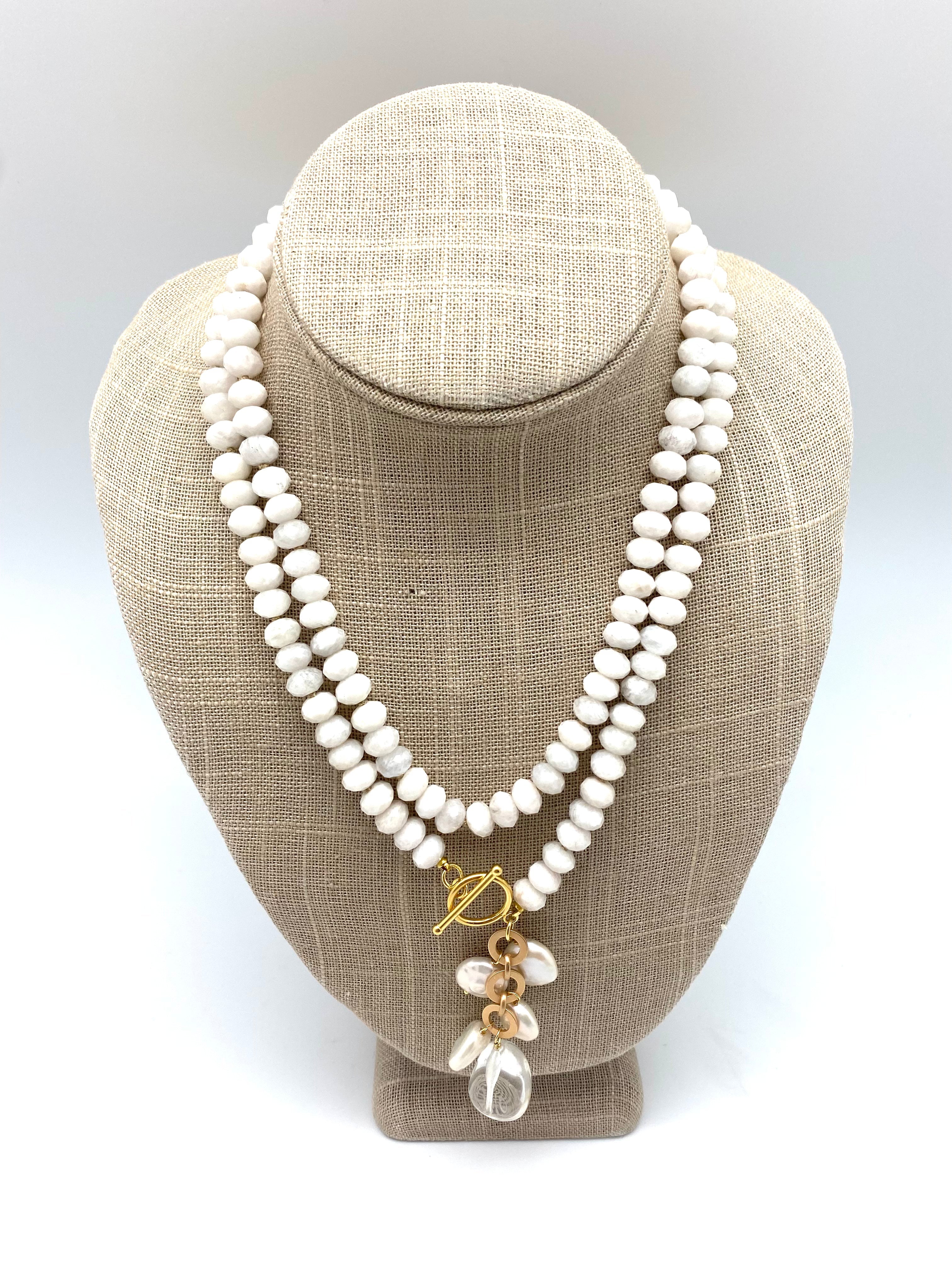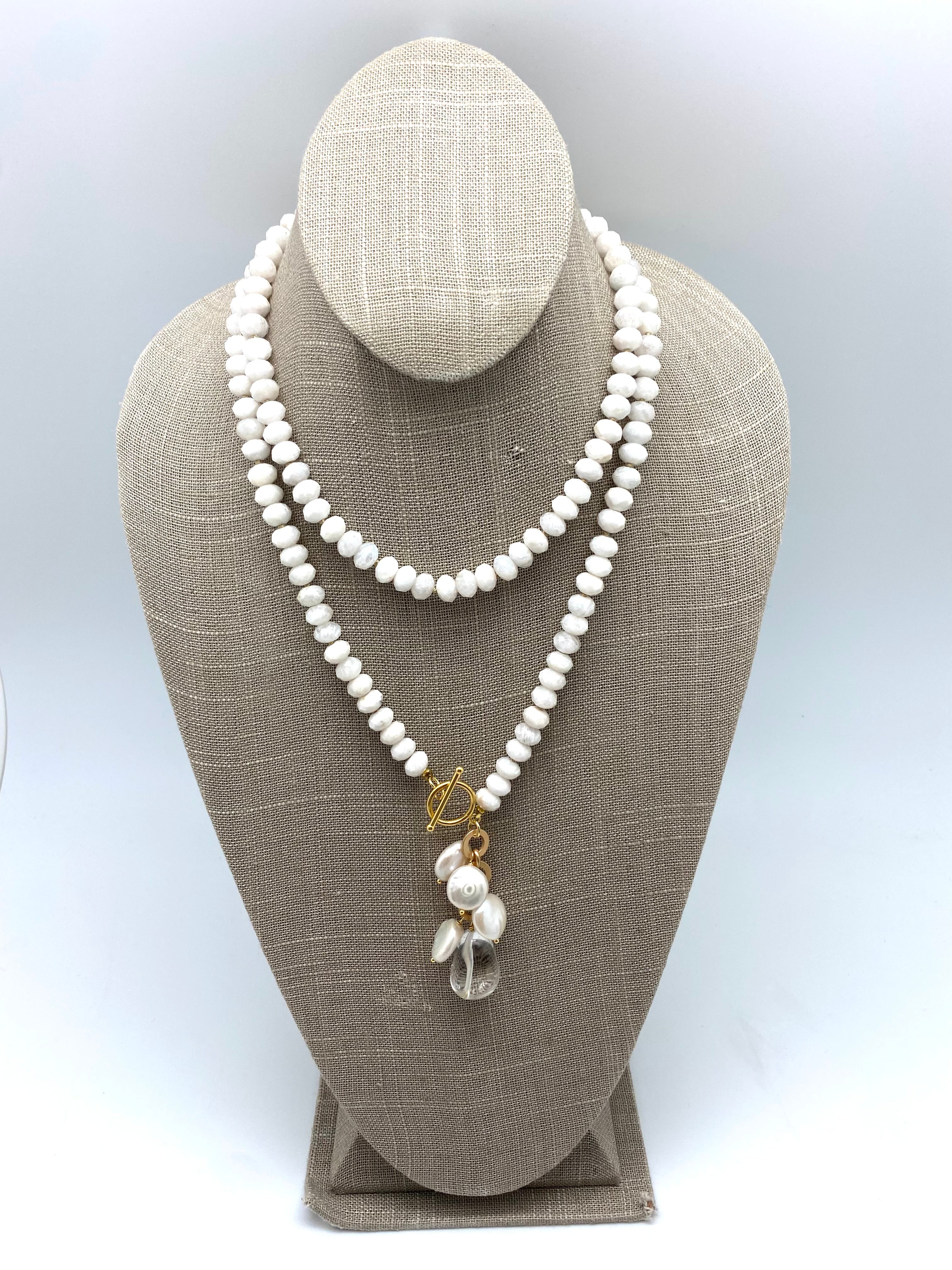 White moonstone and freshwater coin baroque pearls and a natural crystal