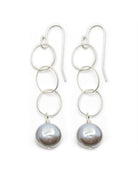 Three fine twisted sterling silver circles with a grey pearl drop. Total drop 2".