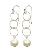 Three fine twisted sterling silver circles with a white pearl drop.Total drop 2".