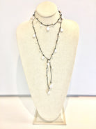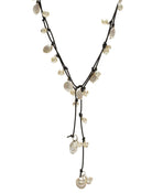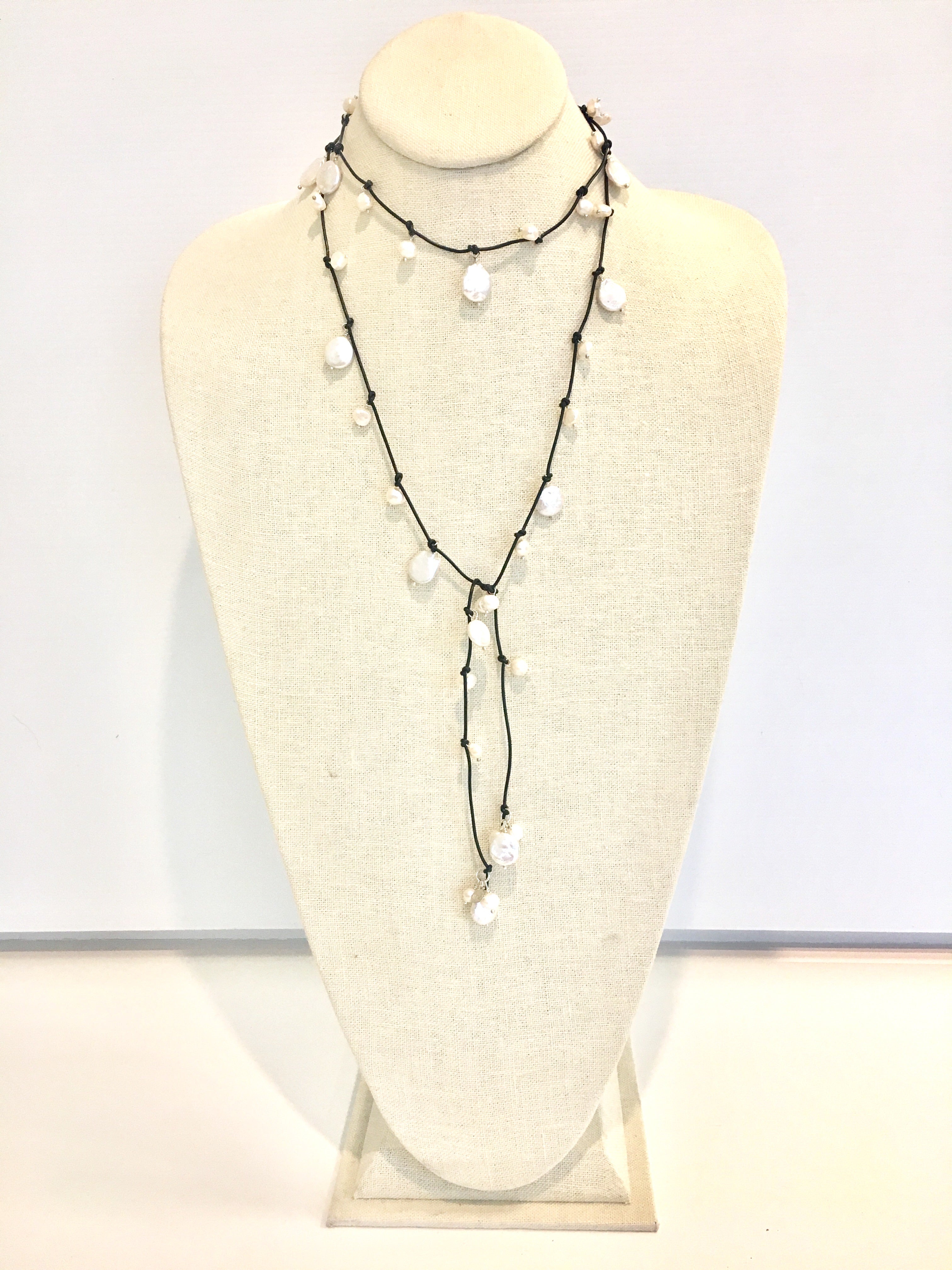 White freshwater coin and round pearls strung on black Greek leather cord attached with silver head pins.