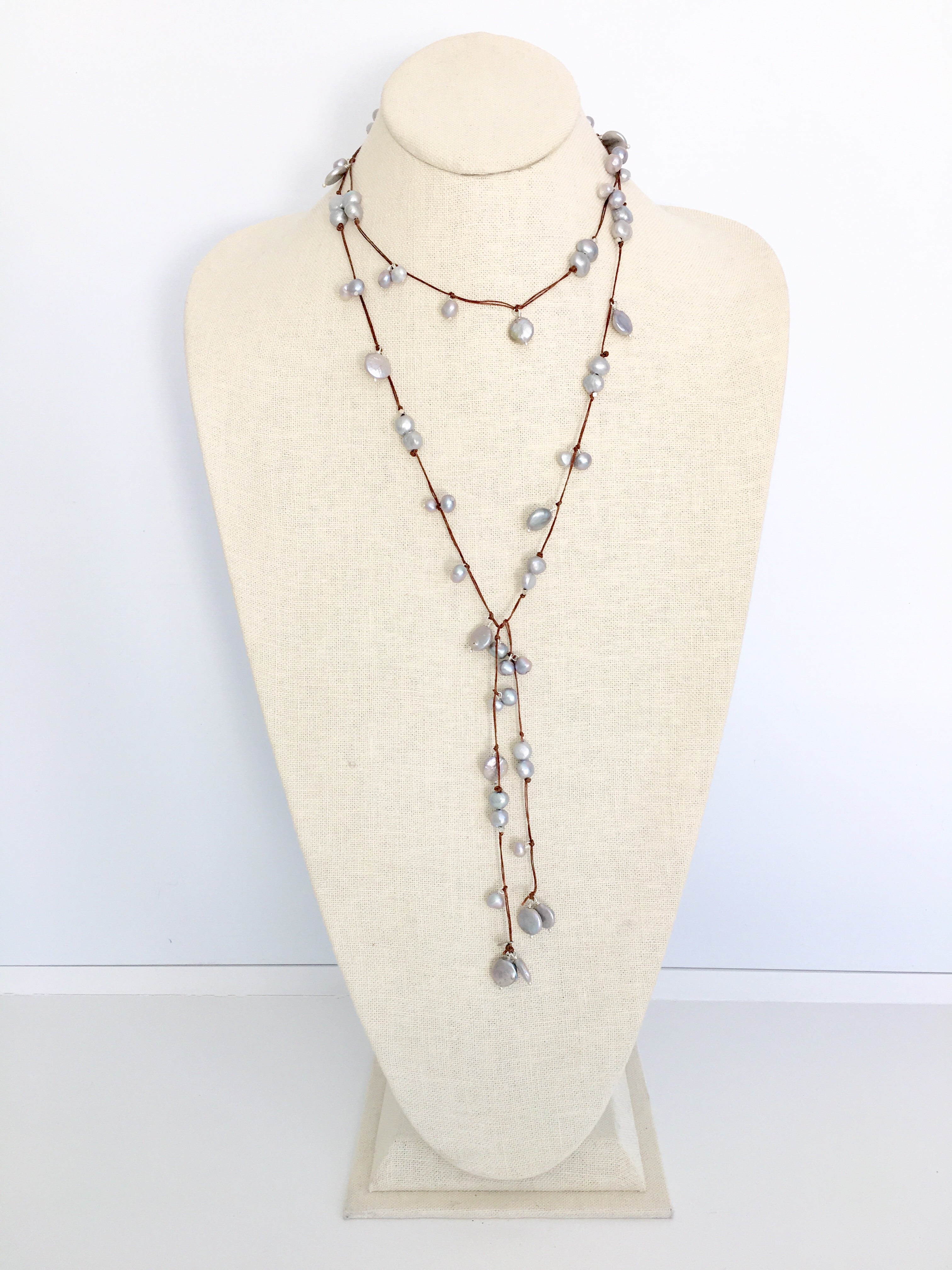 Freshwater grey coin and round pearls Strung on brown Irish waxed linen