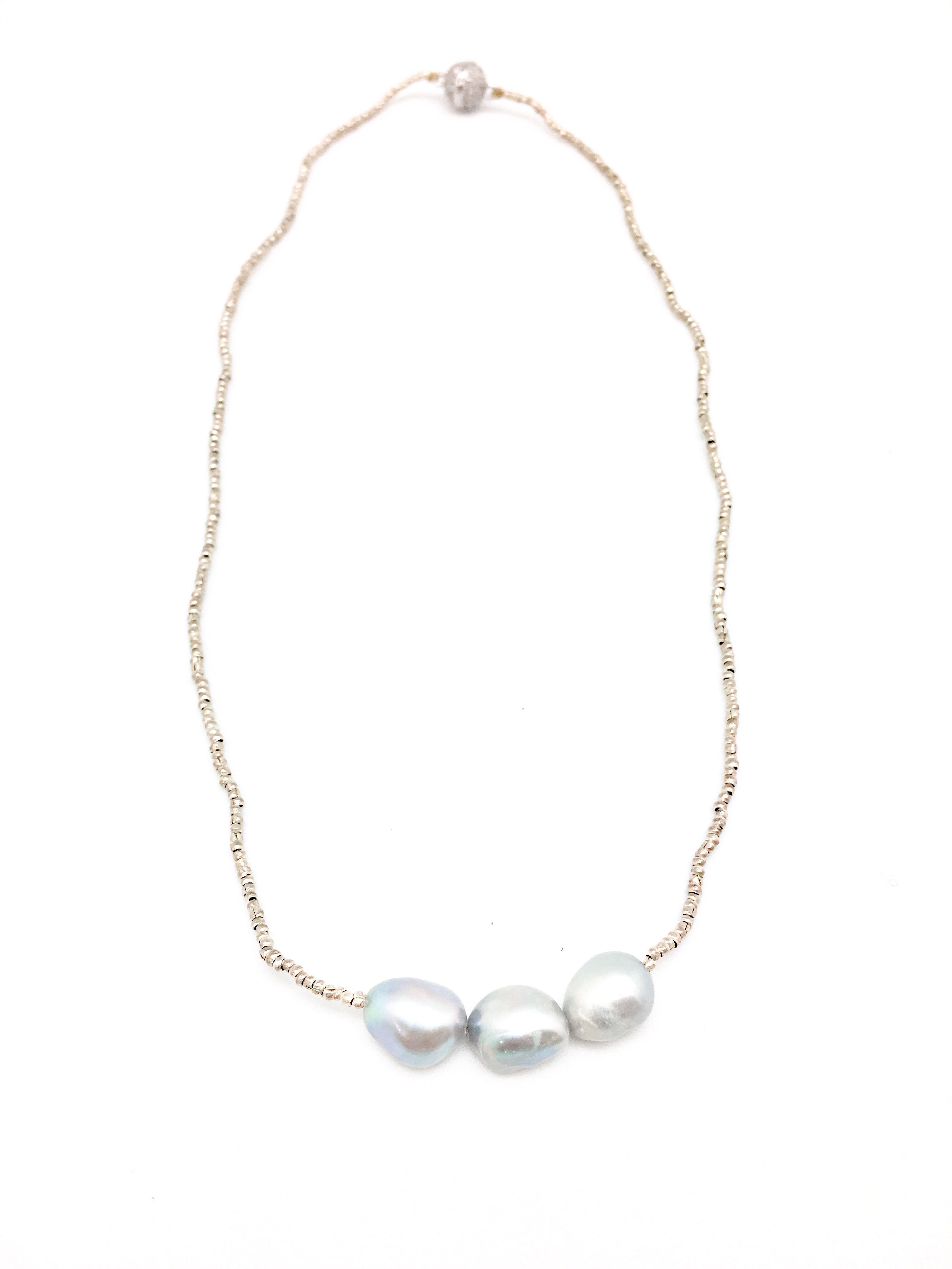 African heishi beads surround 3 light grey pearls. Great go to piece.