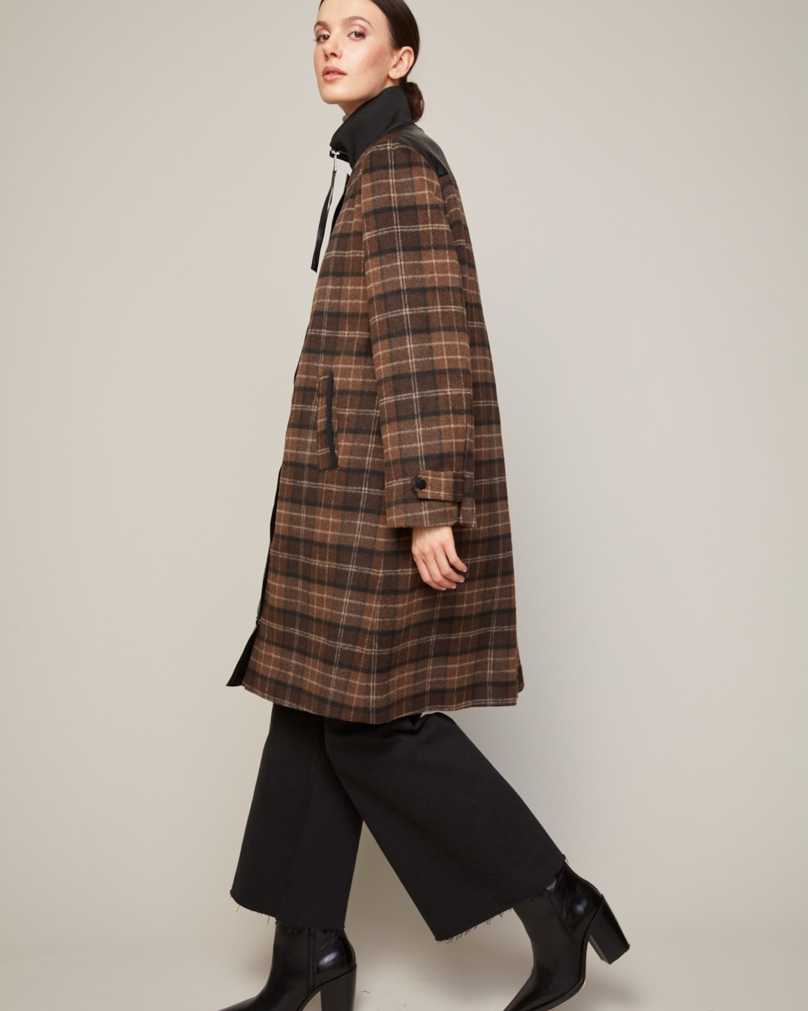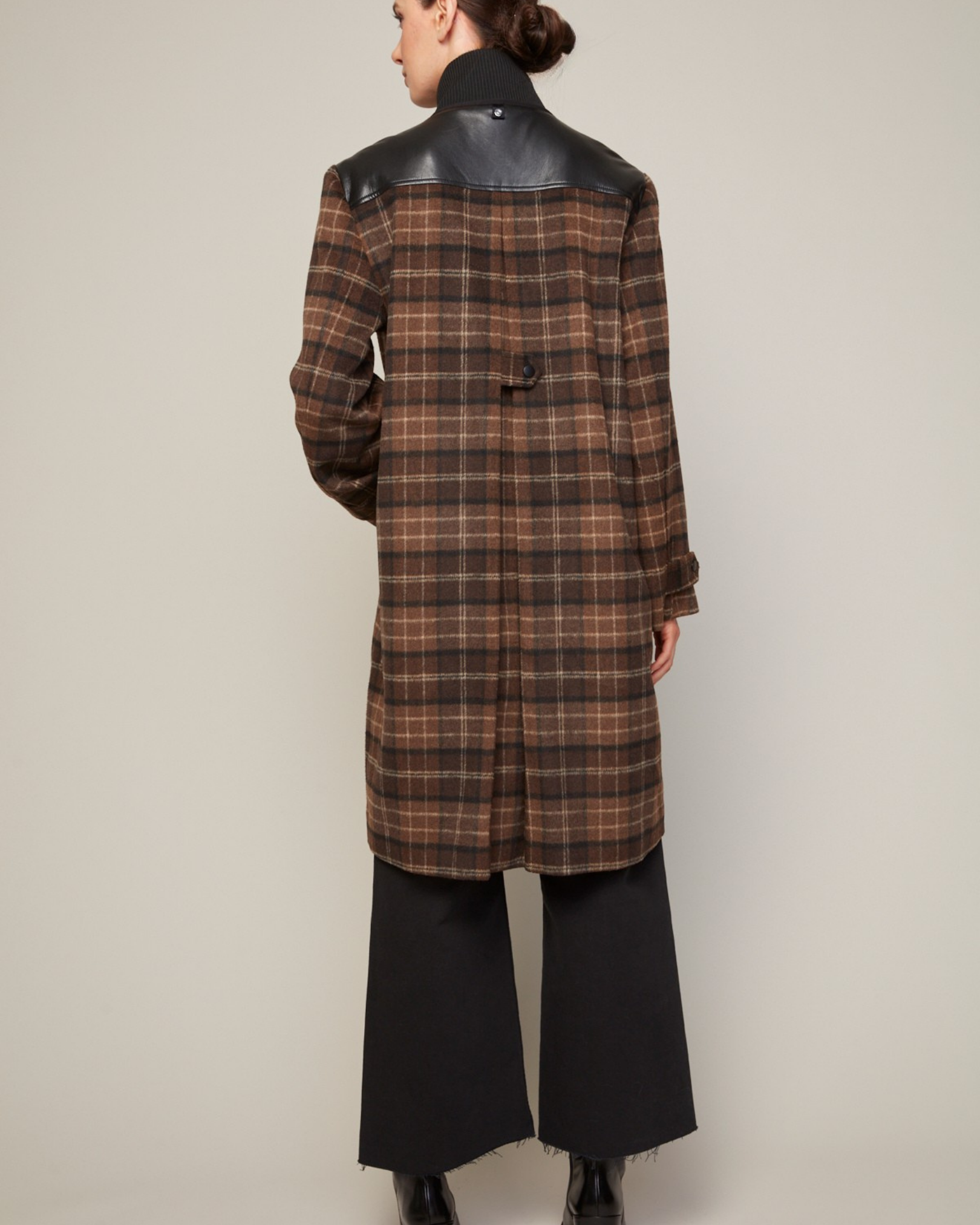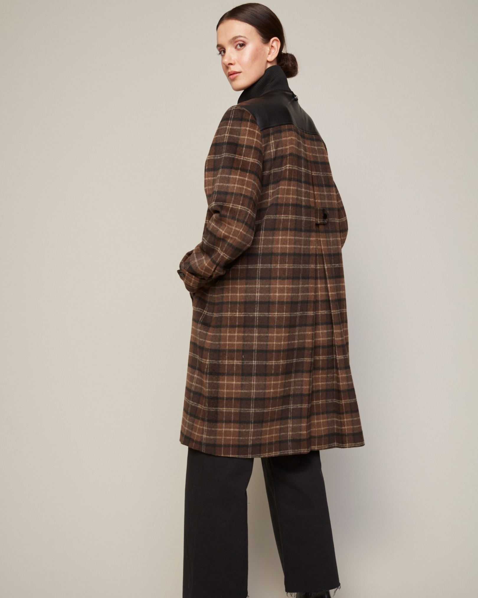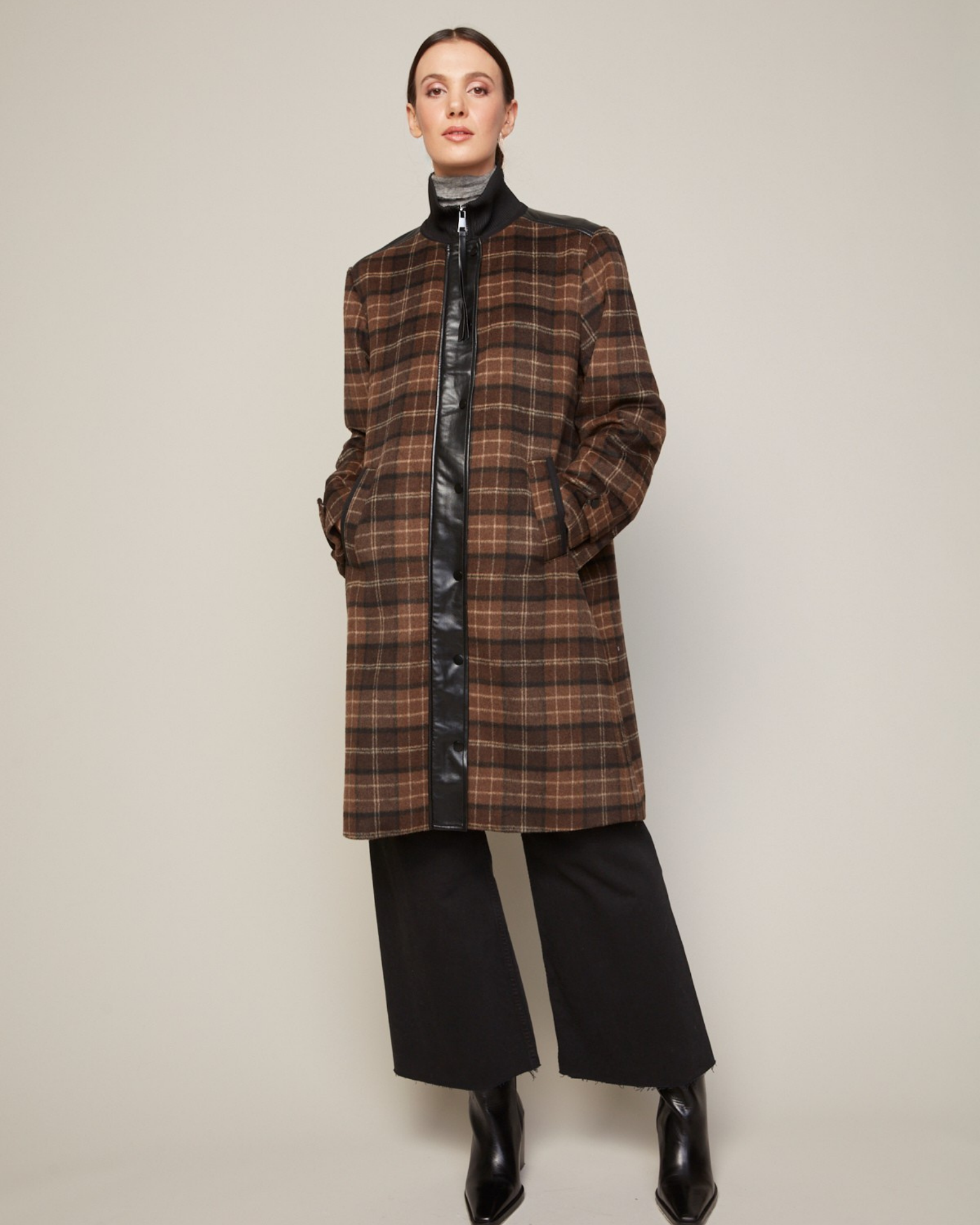 Brooke wool blend plaid coat with vegan leather trims and knit rib collar