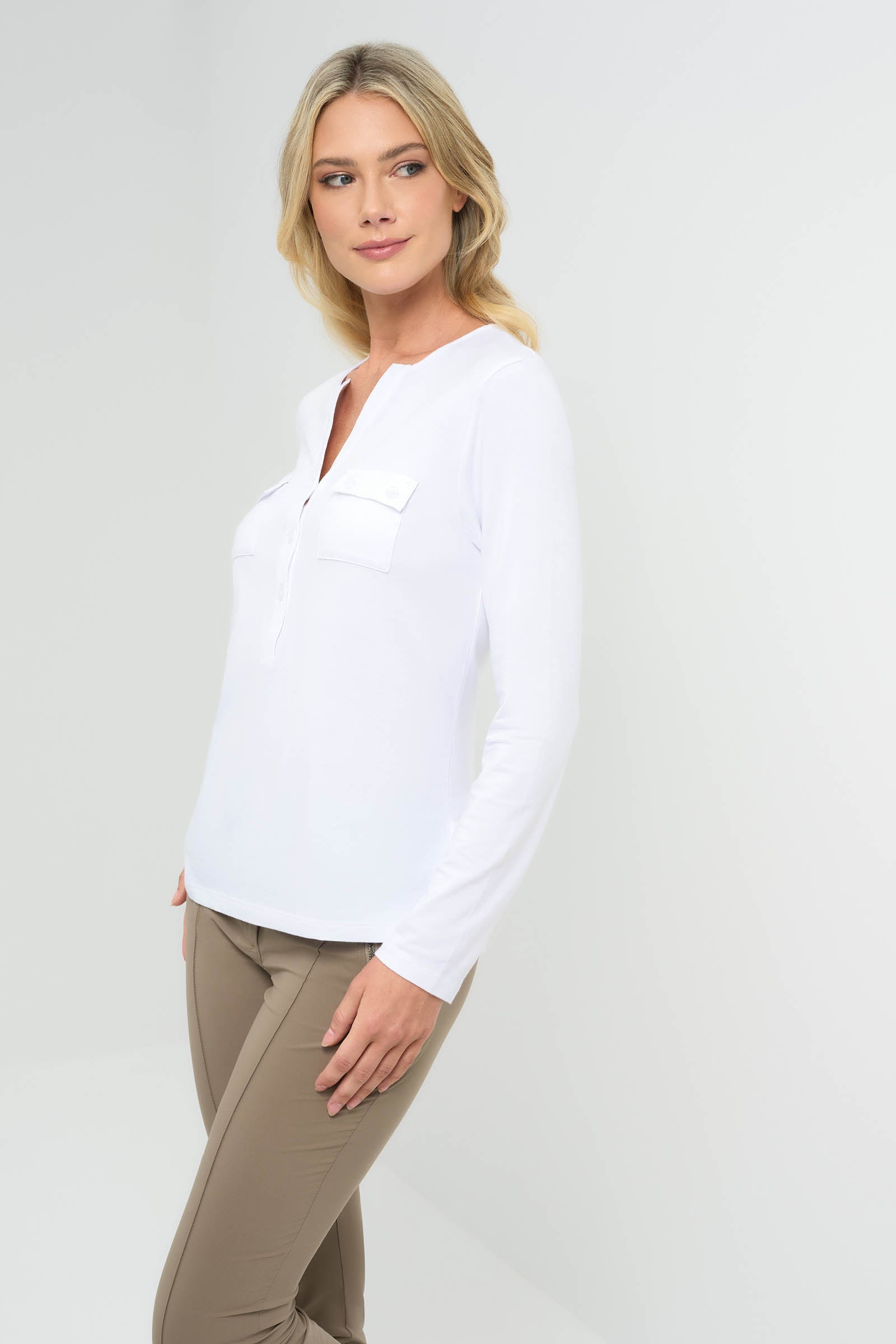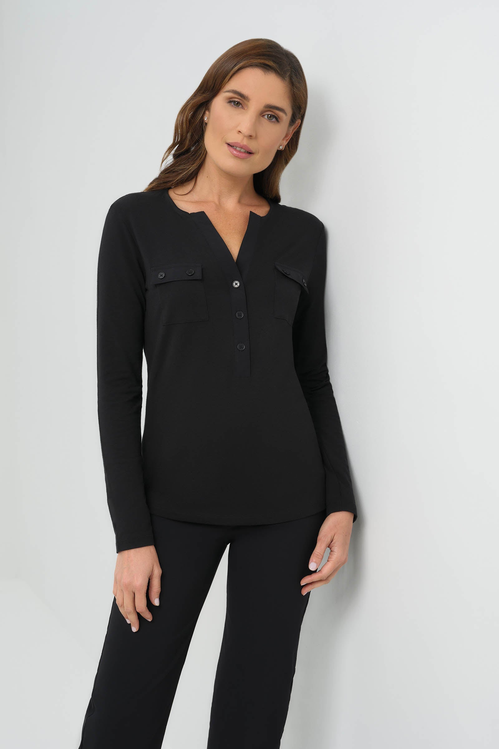 Stretch comfort is our claim to fame, and this women's top embodies this and so much more. We've created the perfect henley style button-front shirt, one you can throw on and to look comfy with your favorite Anatomie pants or roll up to pack in your tote bag and never worry about ironing. Crafted in our comfortable stretch super jersey fabric, this feminine style features full length long sleeves you can roll up or down and front pockets. Impeccable tailoring—a pointed collar, and rounded hem—make it a modern wardrobe essential for #everydayanatomie.