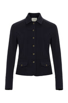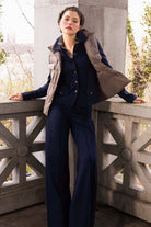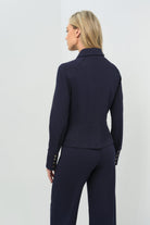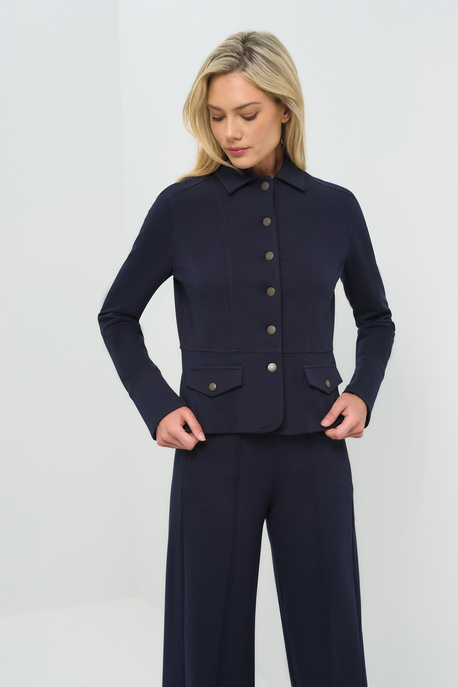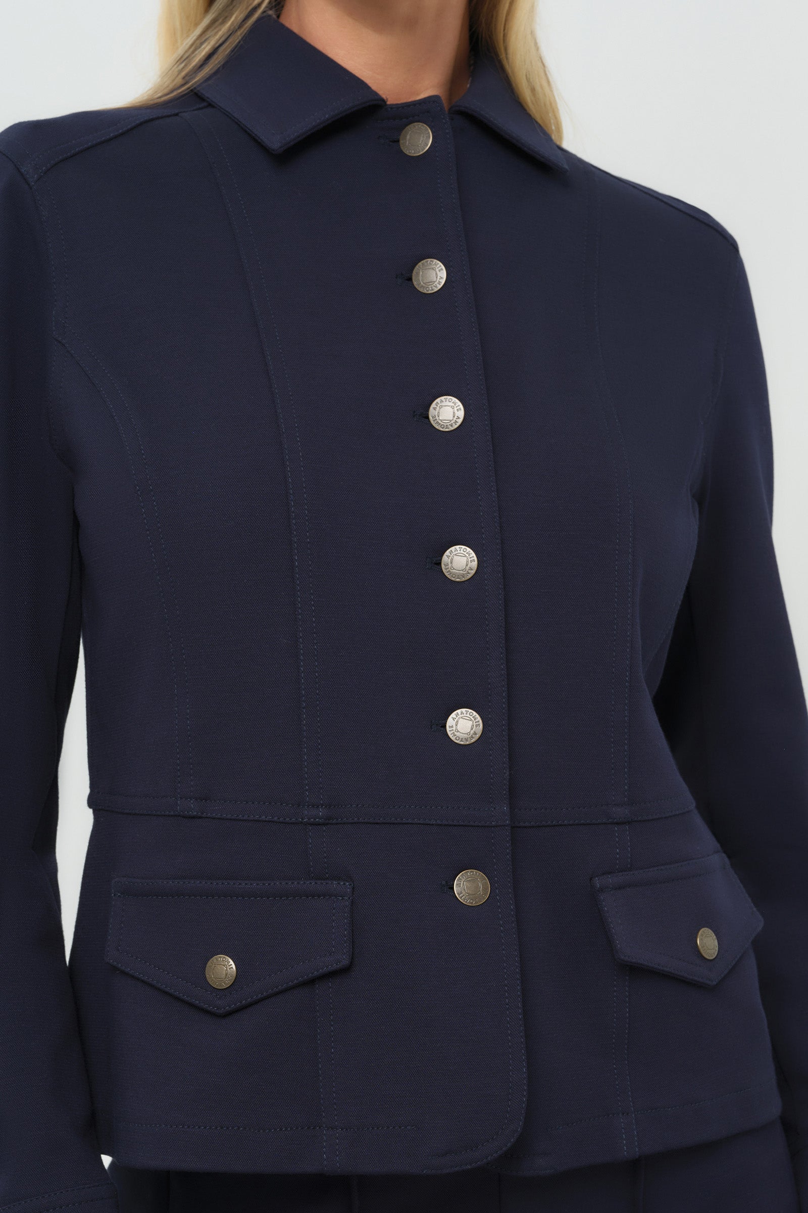 The Caprice Ponte Cropped Tailored Jacket is the ideal fall layer, crafted from woven knit fabric that offers a structured silhouette. Midweight yet substantial, it can be worn alone or layered under a heavier coat for added warmth. Antique brass buttons provide a subtle, elegant detail that enhances its sophisticated style.