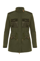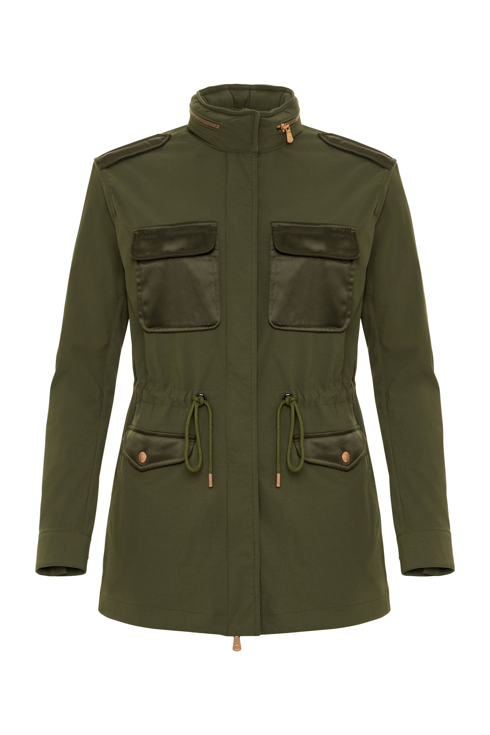 - Contrast Satin Pockets; Hidden Satin Hood Zipped in Collar, Antique Brass Trims