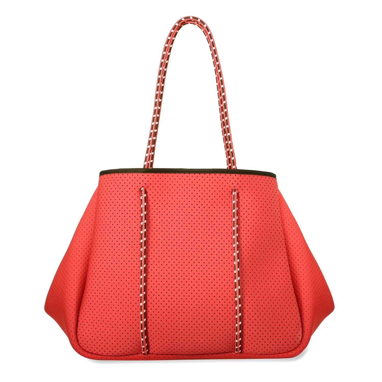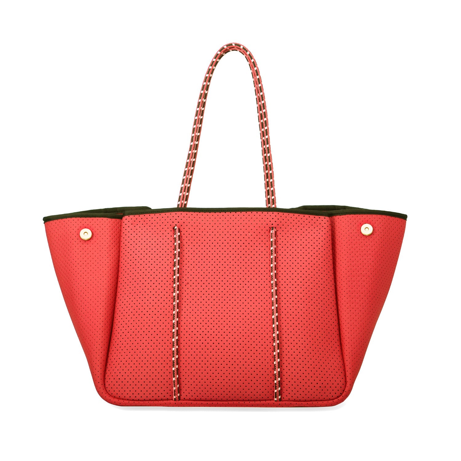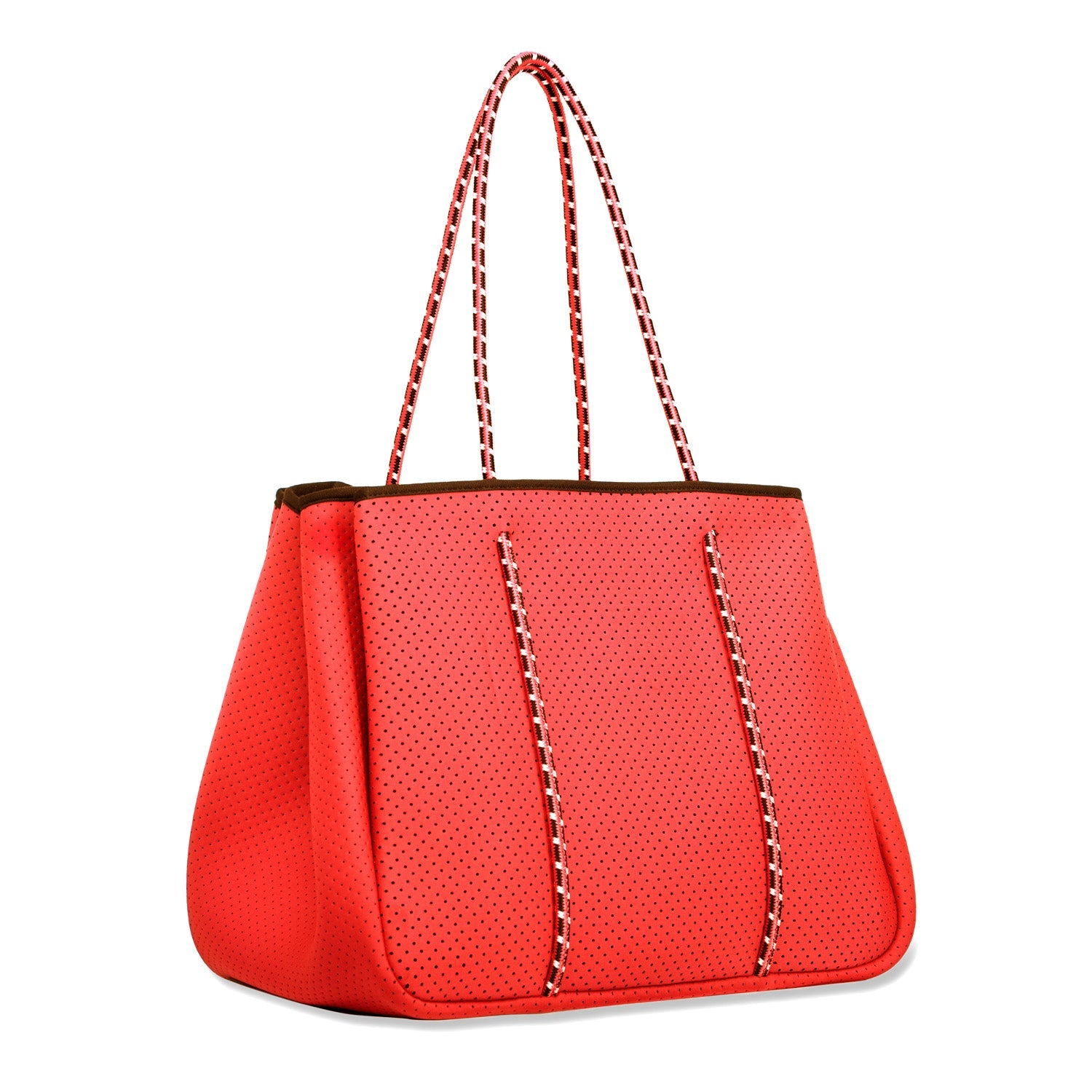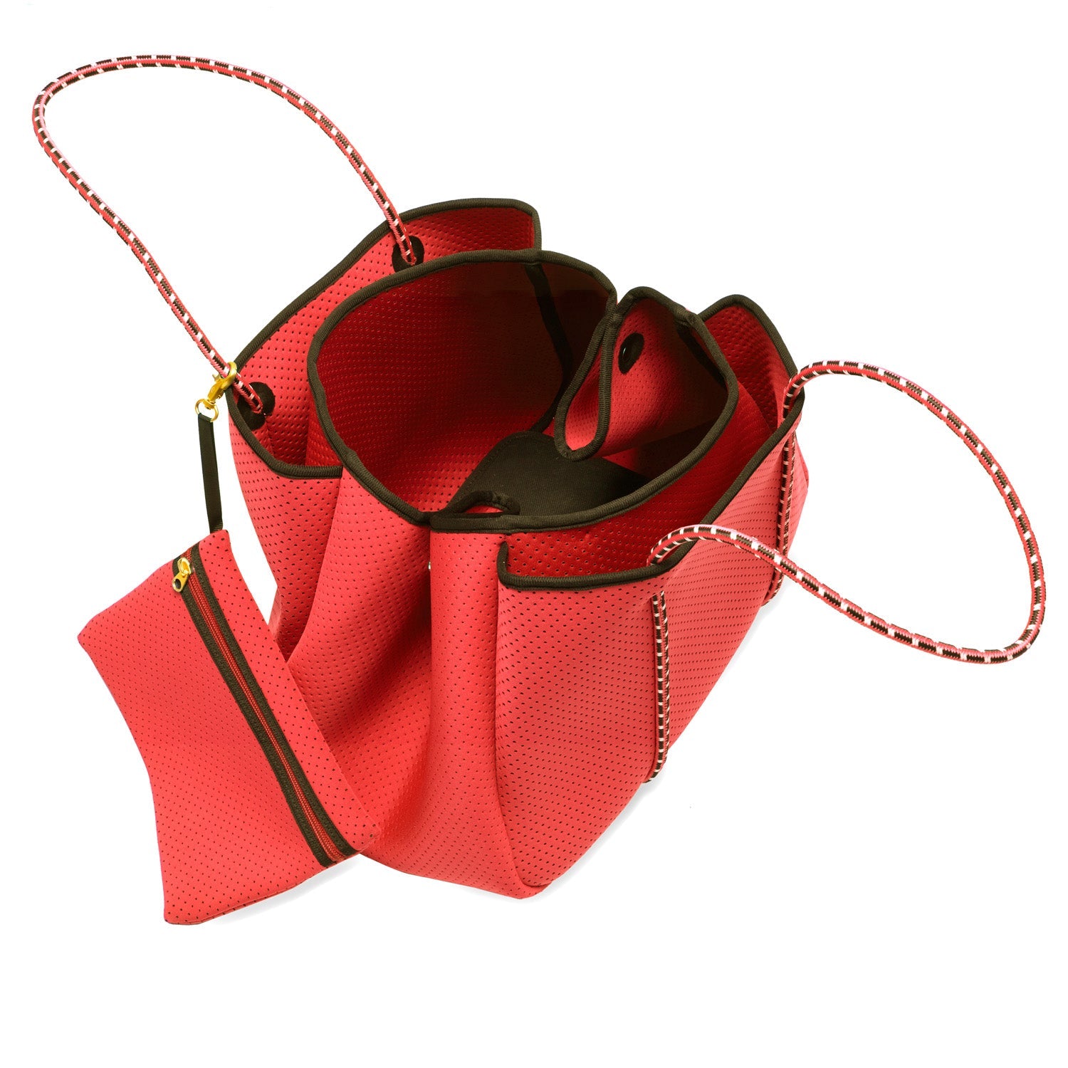 This sexy, sleek Neoprene tote abounds with athletic energy that is equally striking in a yoga class, on the beach, and around the city. The contrasting rope shoulder straps are flexible and lightweight for added on-the-go comfort. The removable pochette with zipper is perfect for storing valuables, and the hidden magnetic studs help minimize the side panels for a slimmer silhouette. See all colors.