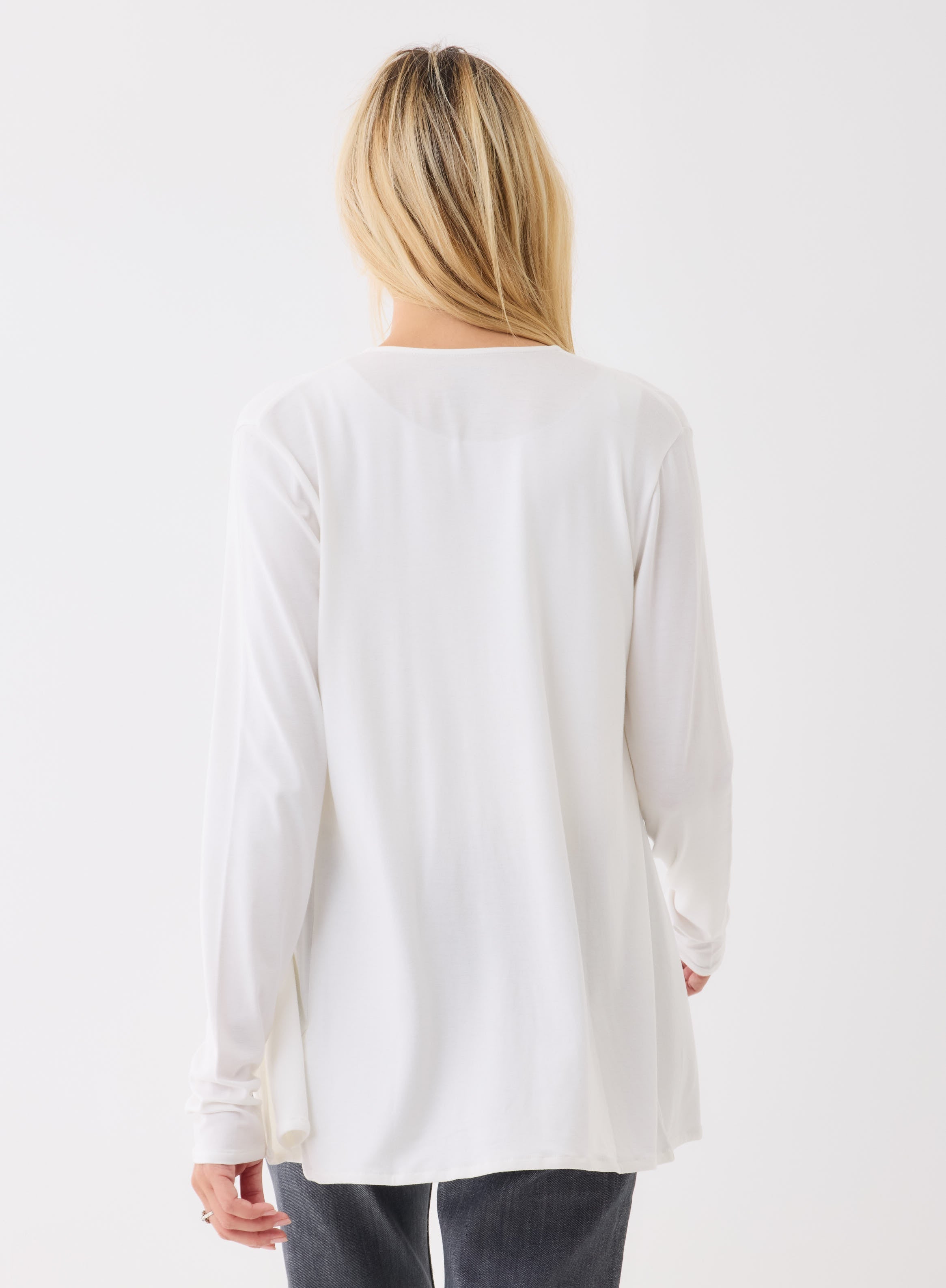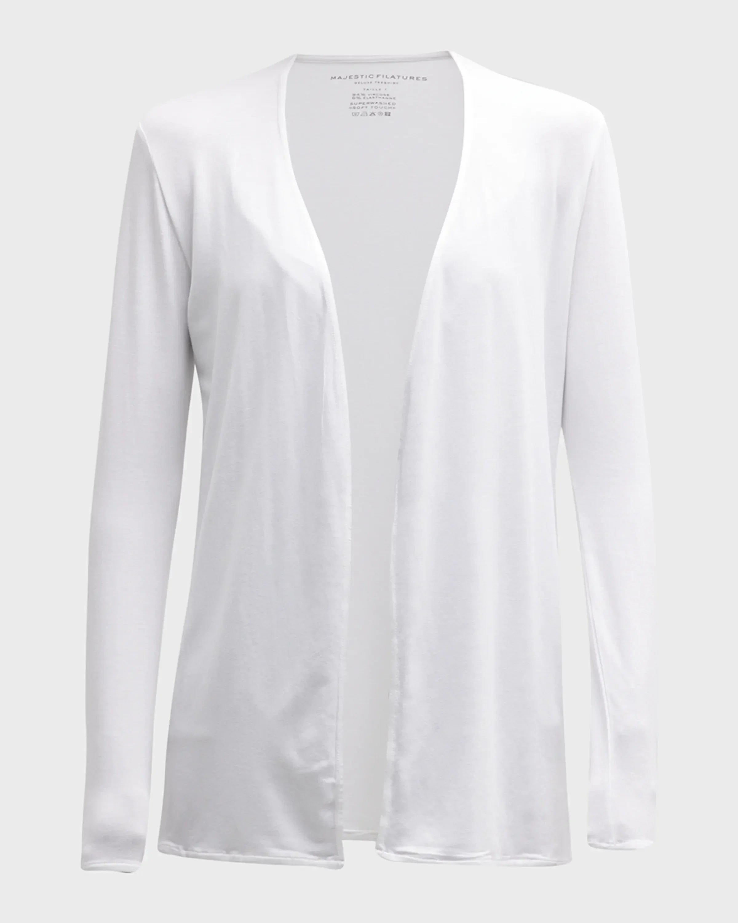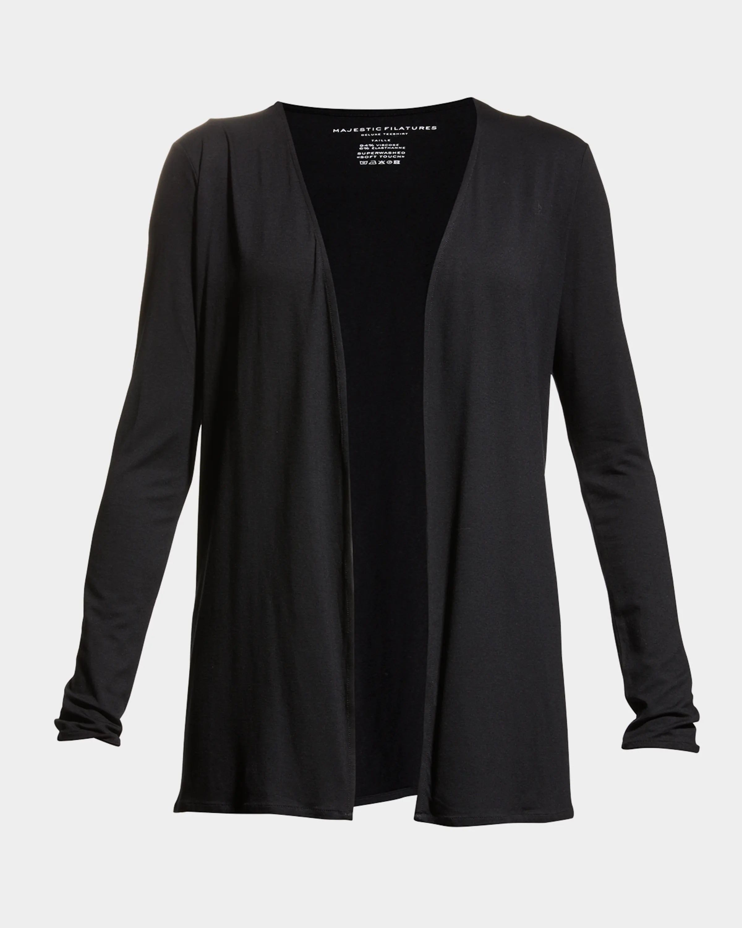 This soft touch open cardigan features a V-Neck button front silhouette. Our soft touch quality is a unique blend of viscose and elastane that has a lightweight, luxurious hand, like a second skin. Pair this seasonless cardigan back to your soft touch essential tees to complete the look.