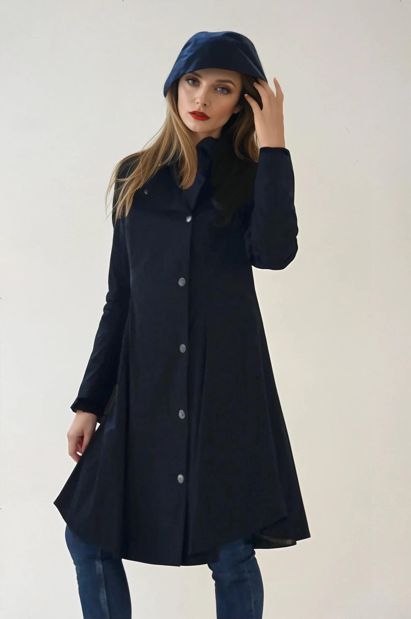 style CELINA - this outstanding water resistant rain coat is like no other in Europe or the U.S. The fabric is the same as our style TESS, SAVINA, ELENA. CELINA not only protects you from the rain, but shapes you at the same time. CELINA has a high collar to keep the rain out and extra wind protection when the hood is down. The large hood, when warn up, protects your face and make up.