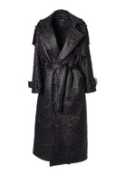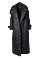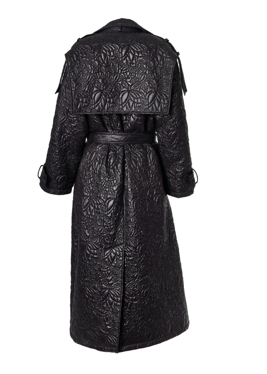 Crafted nylon delicate floral embroidered trench coat, double-breasted with two welt pockets at the front, and a waist belt for an adjustable silhouette.