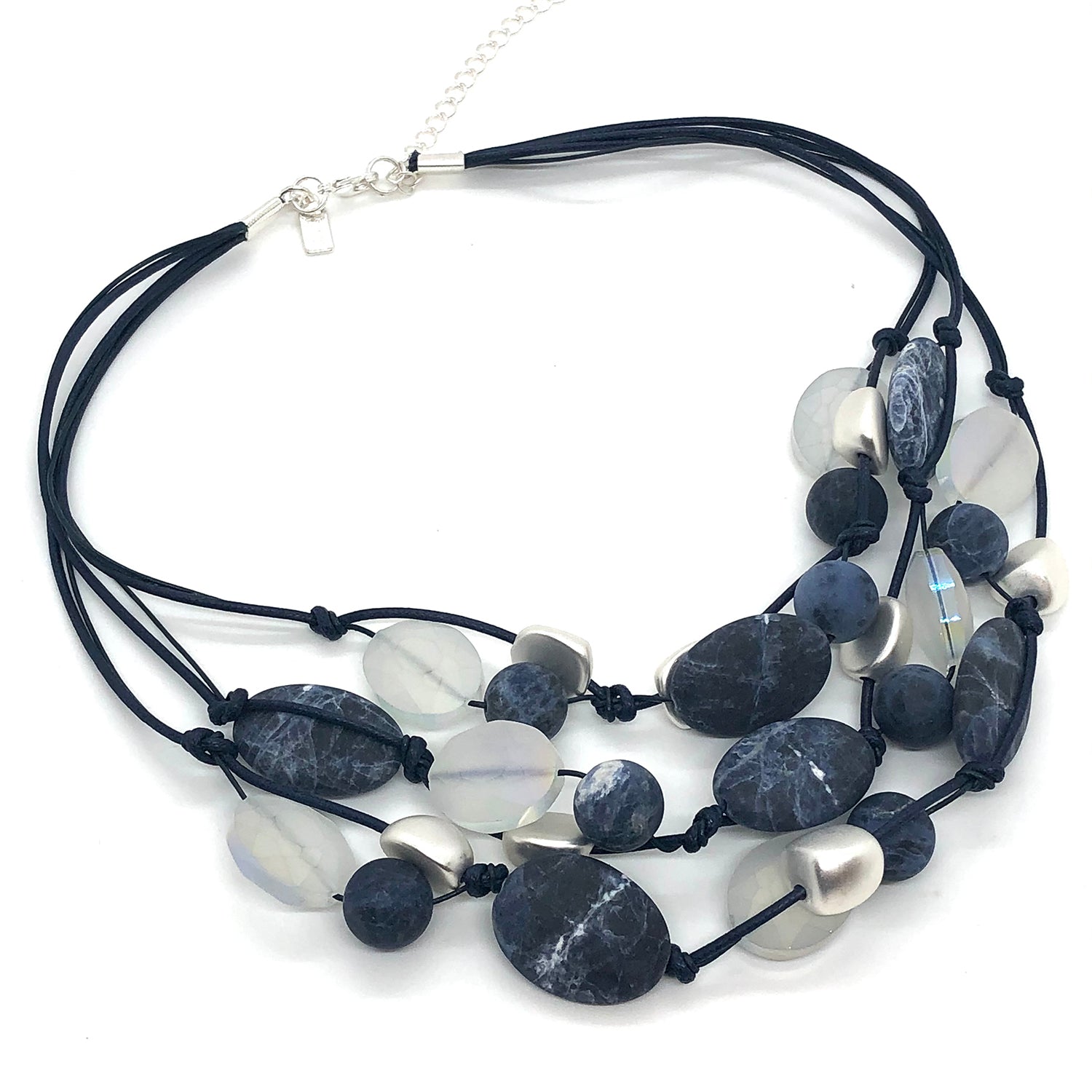 Blue Sodalite With Matte White Oval Crystal And Matte Silver Beads Navy Leather And Linen 3 Strand Torsade Style Necklace