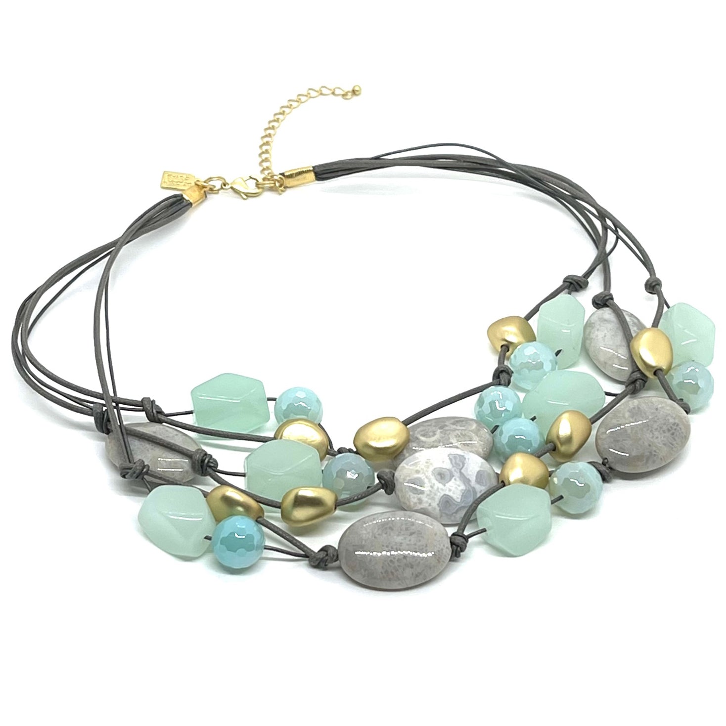 Gray Fossil Coral, Aqua Agate, and Quartz With Matte Gold Bead Gray Waxed Linen And Platinum Leather Torsade Necklace