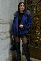 This stylish cropped wool trench jacket features intricate embroidery on the belts and epaulettes. It is crafted from double-sided cashmere wool fabric, allowing for easy layering. The jacket includes epaulettes at the shoulders and a detachable fox fur collar, along with a belted waist that creates a flattering, draped silhouette.