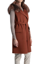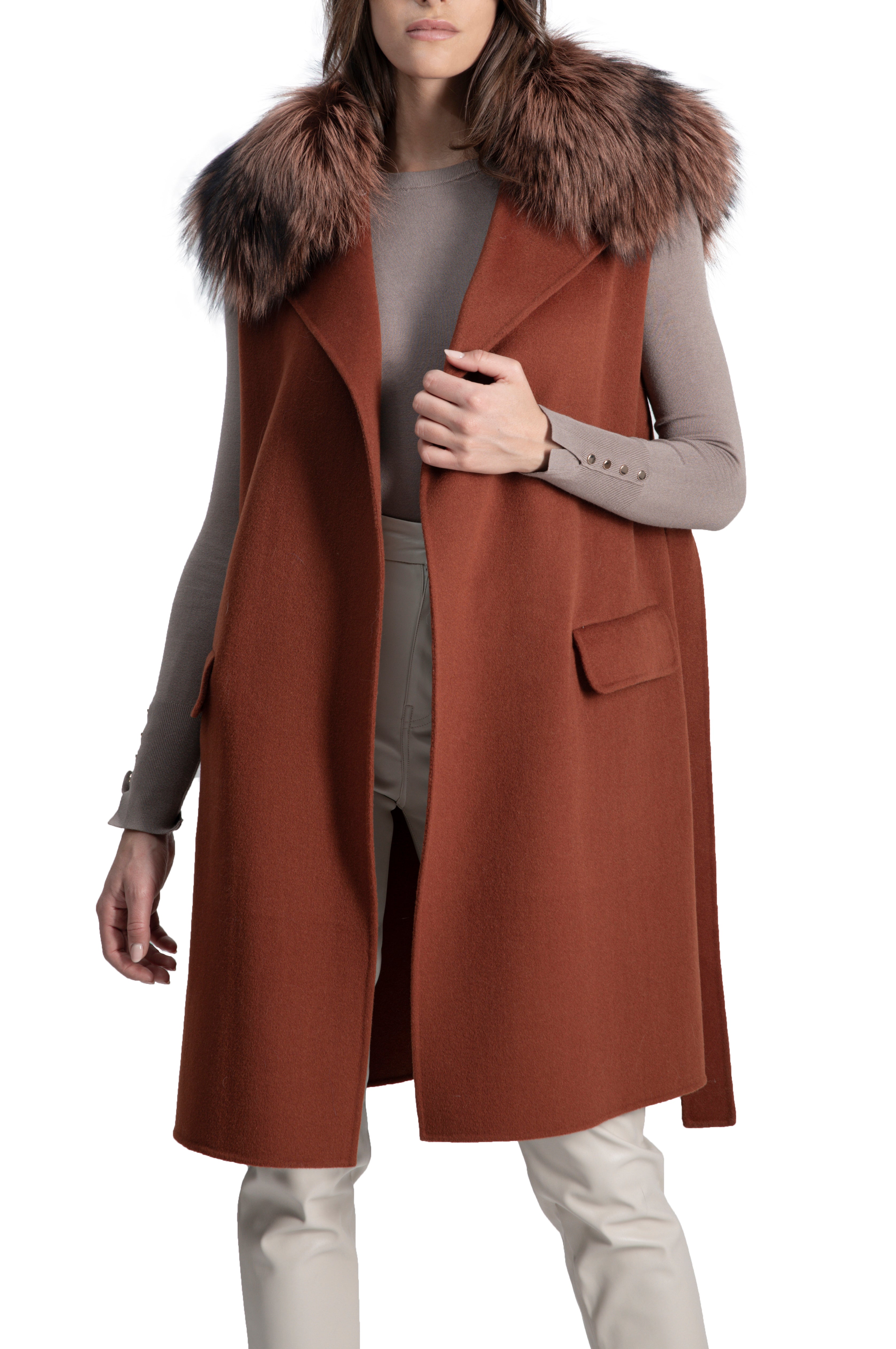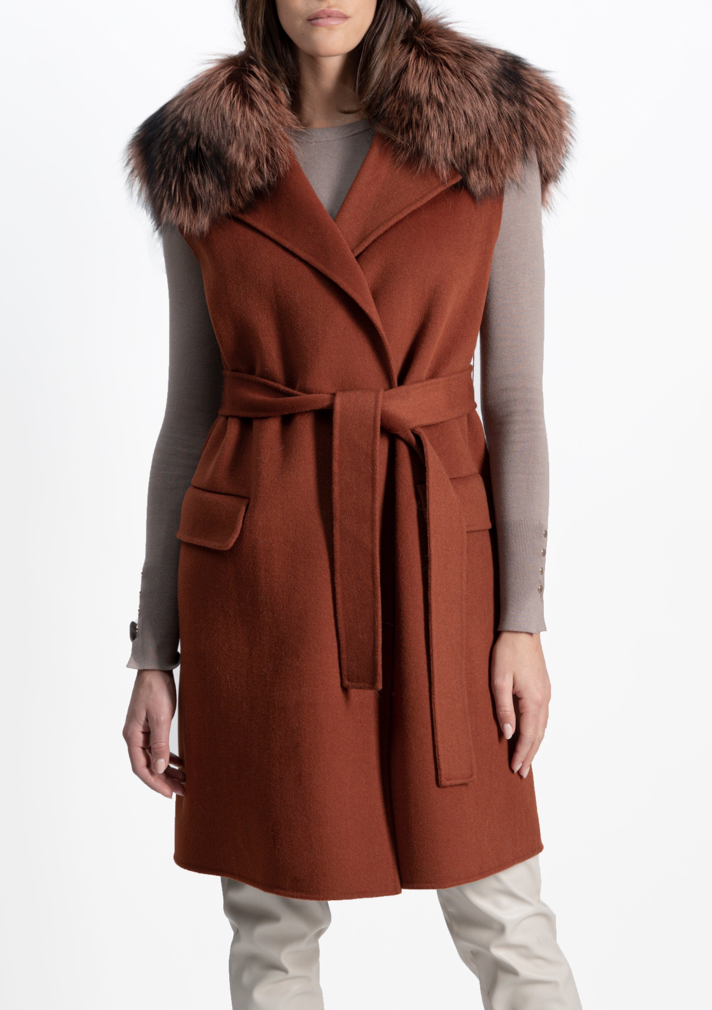The long wool vest is crafted of a wool-cashmere blend and features a short-sleeve design. Notch lapels and a cinching belt complete the look.