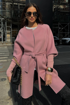 This spacious coat, made of flowing wool and cashmere with rib-knit wool cuff sleeves, features clean lines and elegant details, creating a lovely gathered effect. The coat offers the wearer multiple styling options. It comes with a detachable belt for cinching, and a rounded collar that accentuates the face and neck.