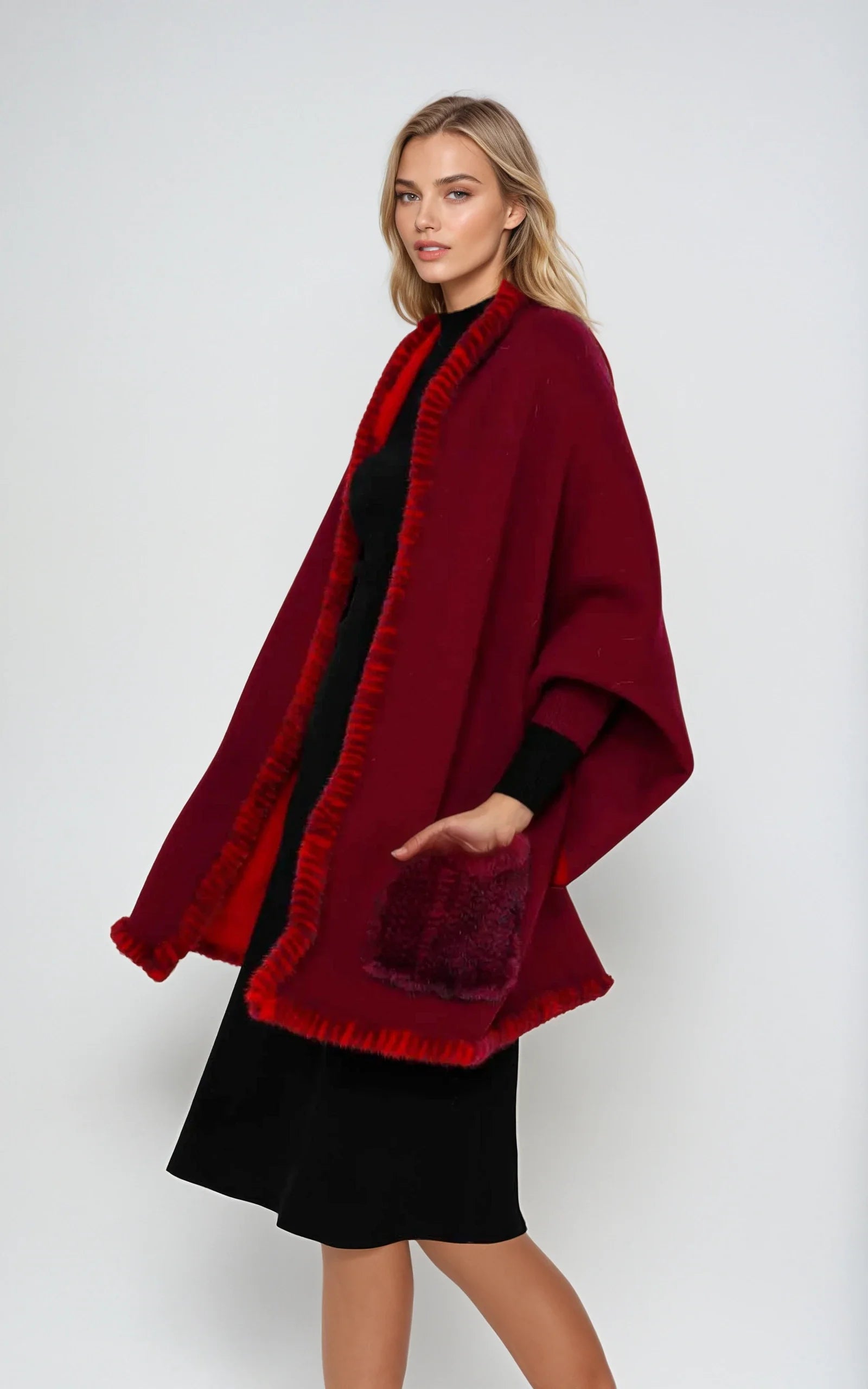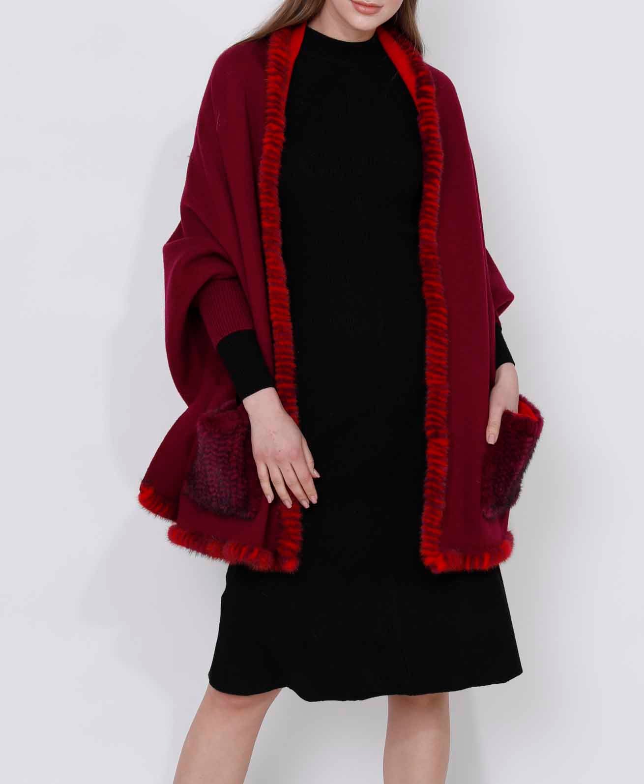 Woven Wrap With Cuff And Mink Trimming In Fushia/Red