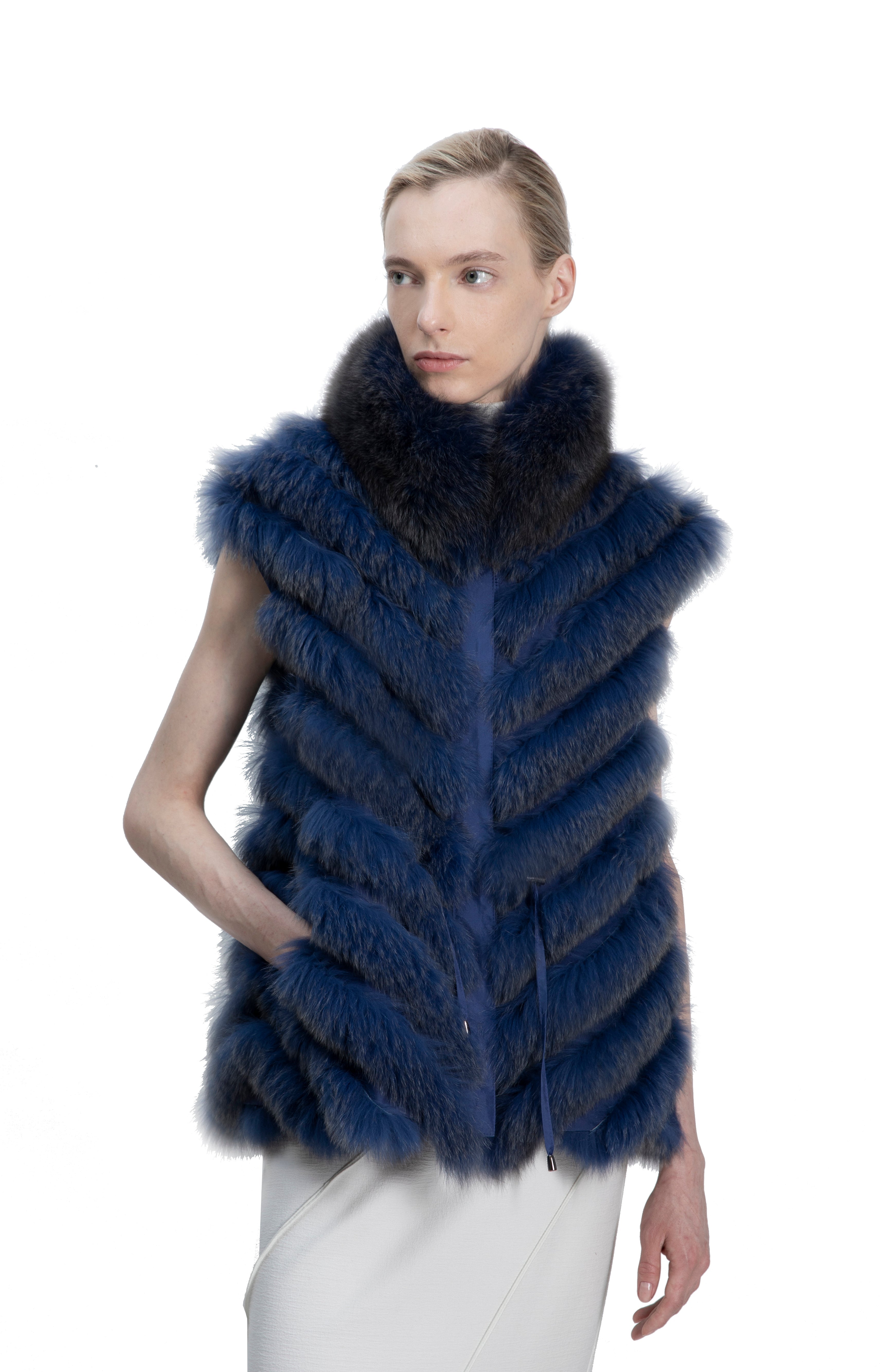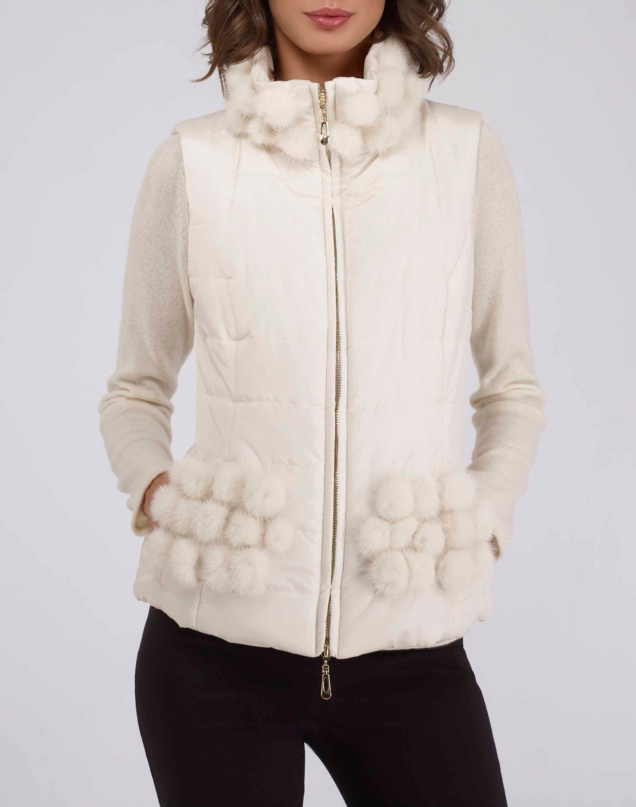 Nylon Vest With Mink Collar & Pocket Trim In Navy