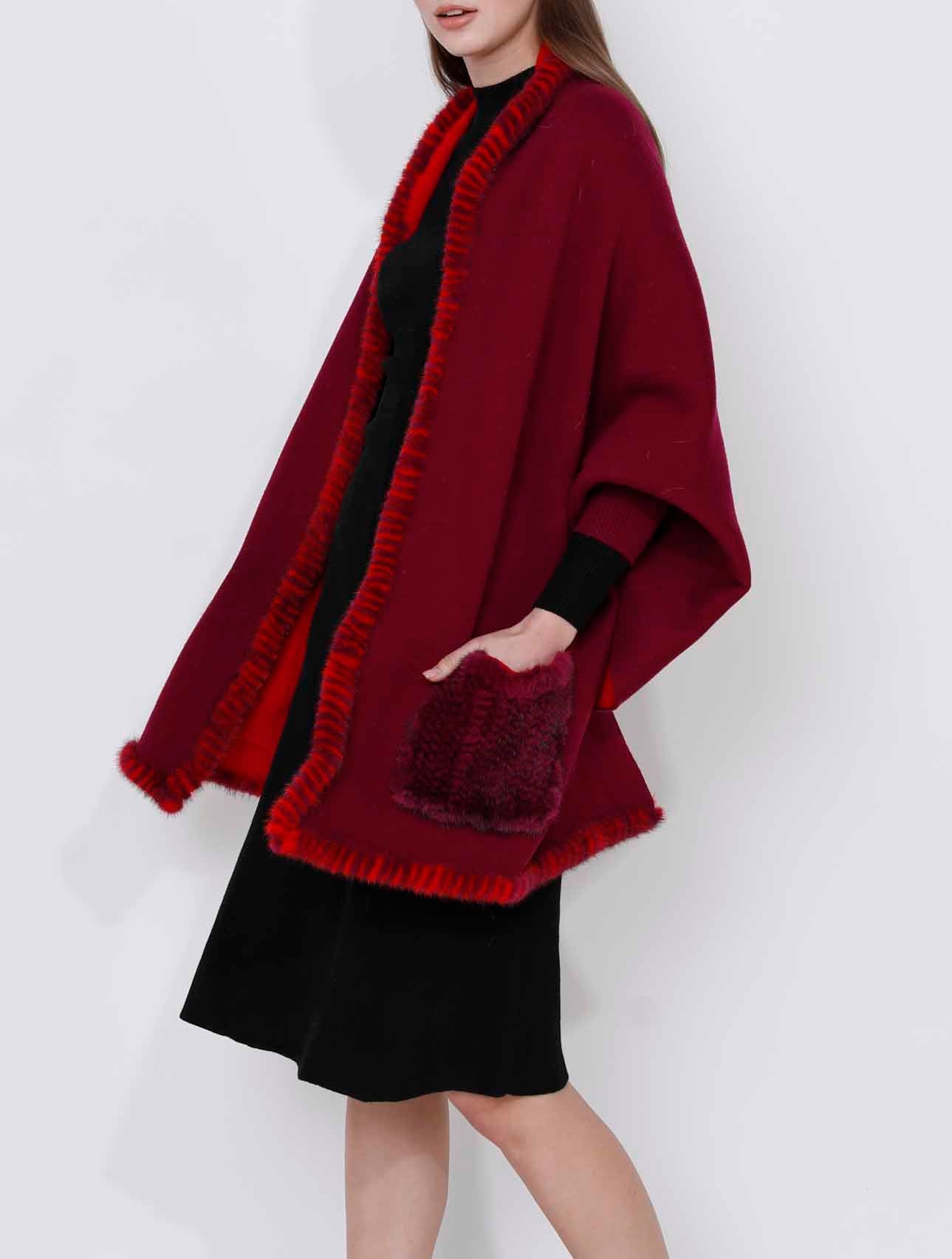 Woven Wrap With Cuff And Mink Trimming In Fushia/Red