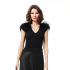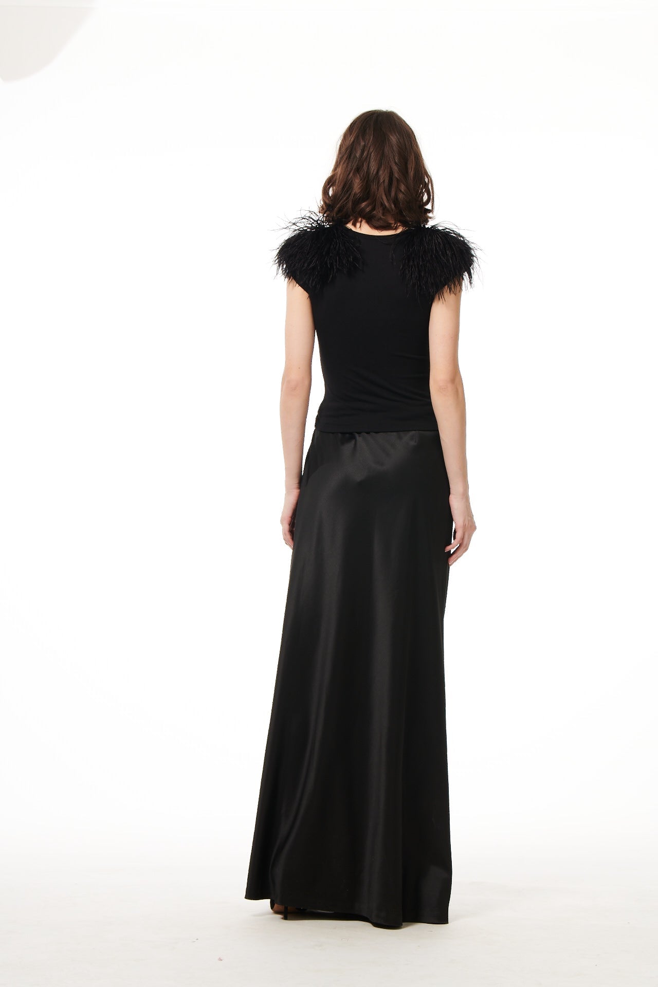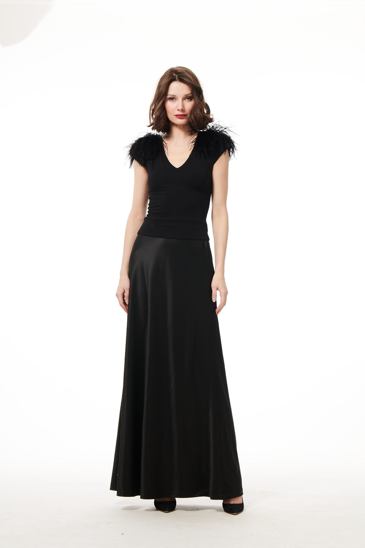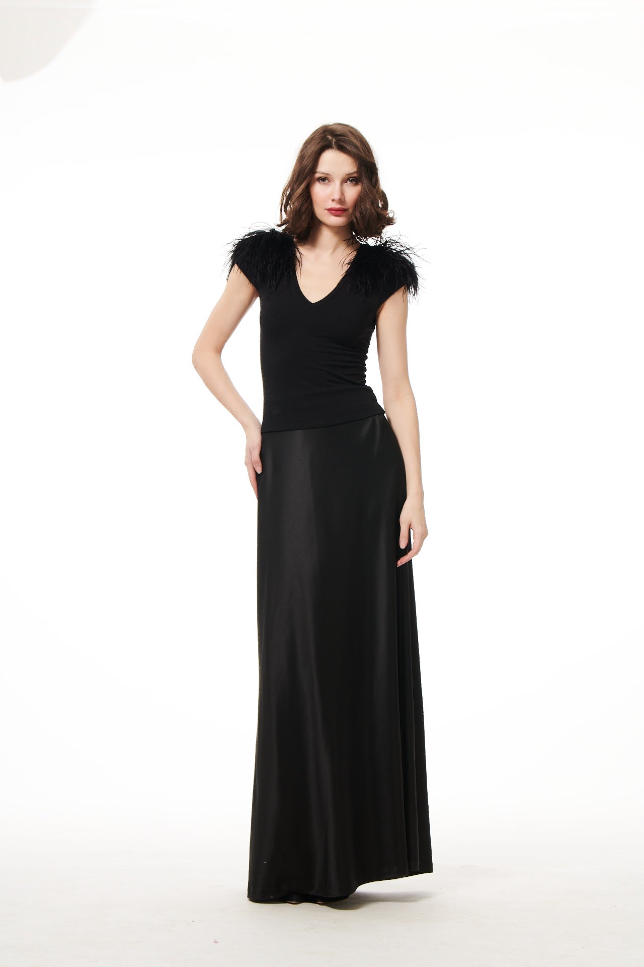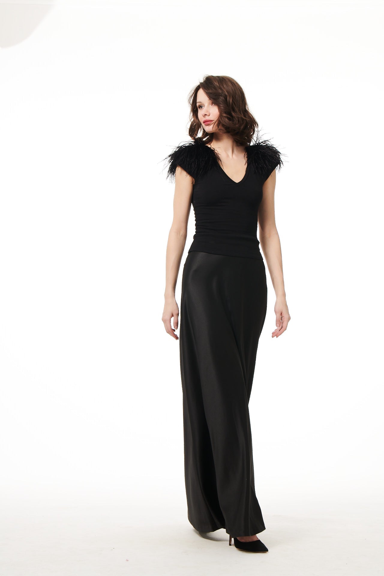 Luxurious double jersey V-neck top is adorned with fun feather caps.  Old world glamour takes this tee to the next level.  Wear with our bias matte satin skirts, our taffeta skirts, and designer's choice - the taffeta animal print pants.