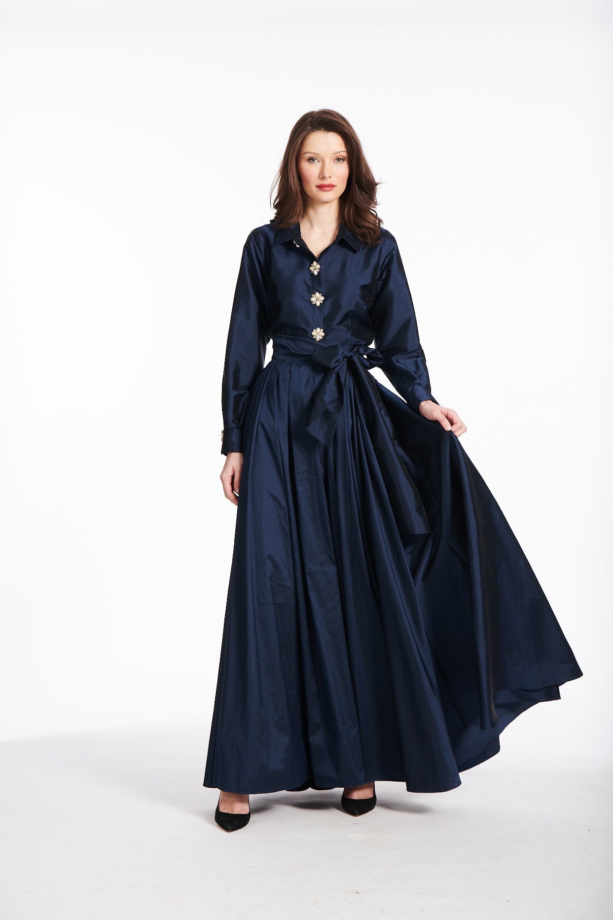 Our classic taffeta blouse with exquisite hand beaded oversized pearl buttons. Removable taffeta sash to tie at waist. Wear with our animal jacquard skirt for elegant drama, our any of our taffeta skirts. Wear again with your favorite jeans already in your closet.