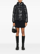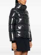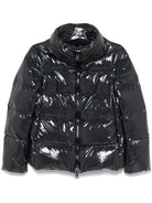 The Gloss Zipper Jacket in Ferro combines refined elegance with functional design. Its smooth nylon fabric with a subtle sheen offers a soft, lightweight feel, while the short length and shaped waist create a sporty yet feminine silhouette. Filled with premium goose down and feathers, it ensures exceptional warmth. The collar zips up to a stand-up style for added cold protection, and the logo patch on the back adds a sophisticated finishing detail, making this jacket versatile for various occasions.