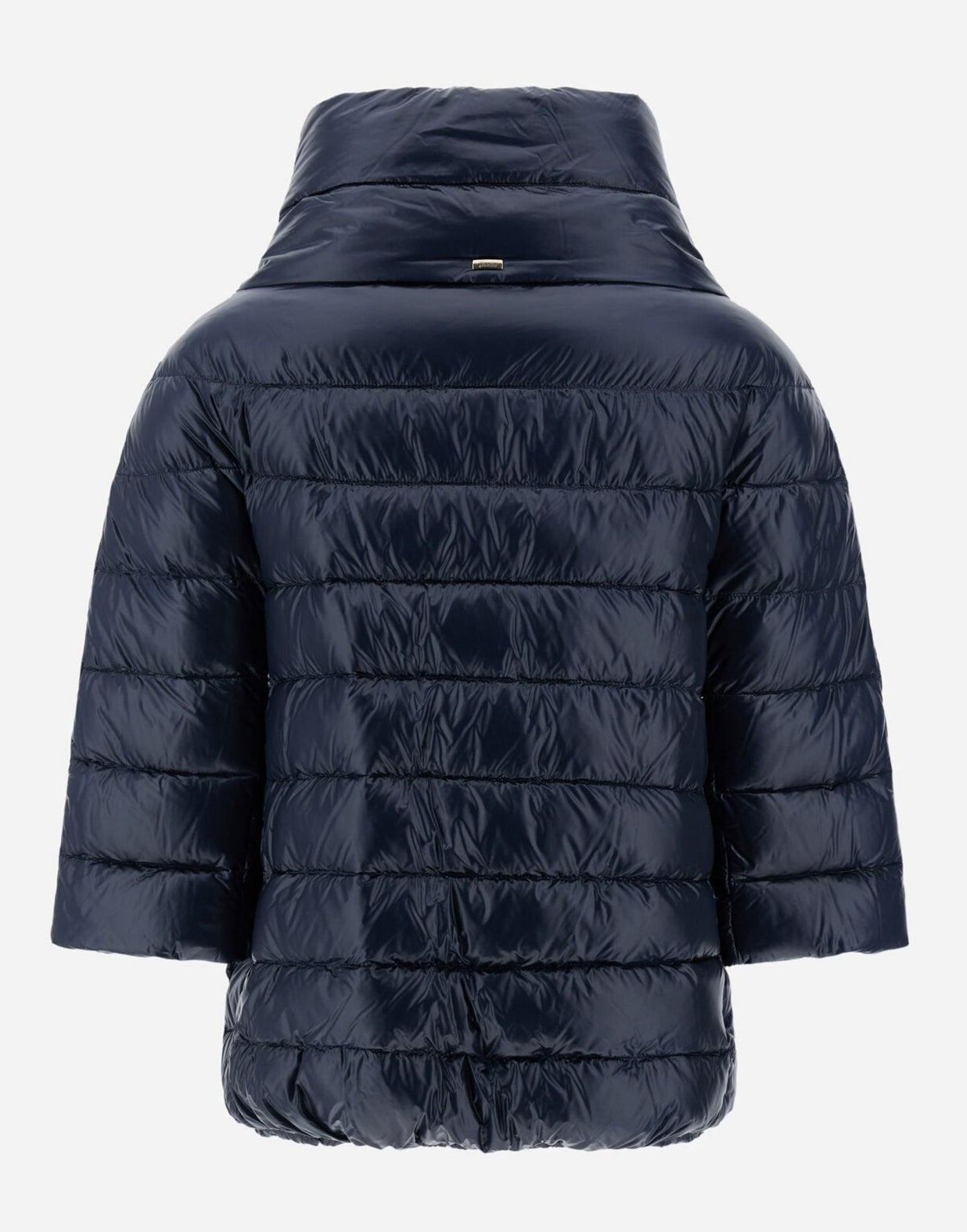 This navy blue piece features a front press-stud closure, two side slit pockets, a stand-up collar, and long sleeves, combining practical design with refined detailing.