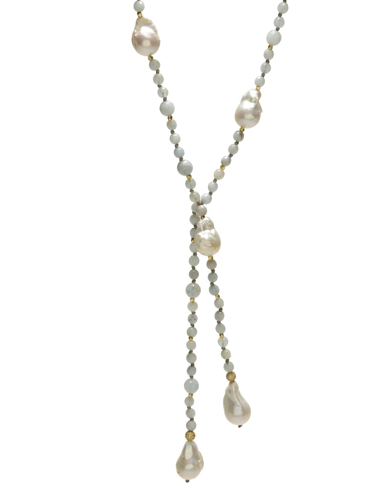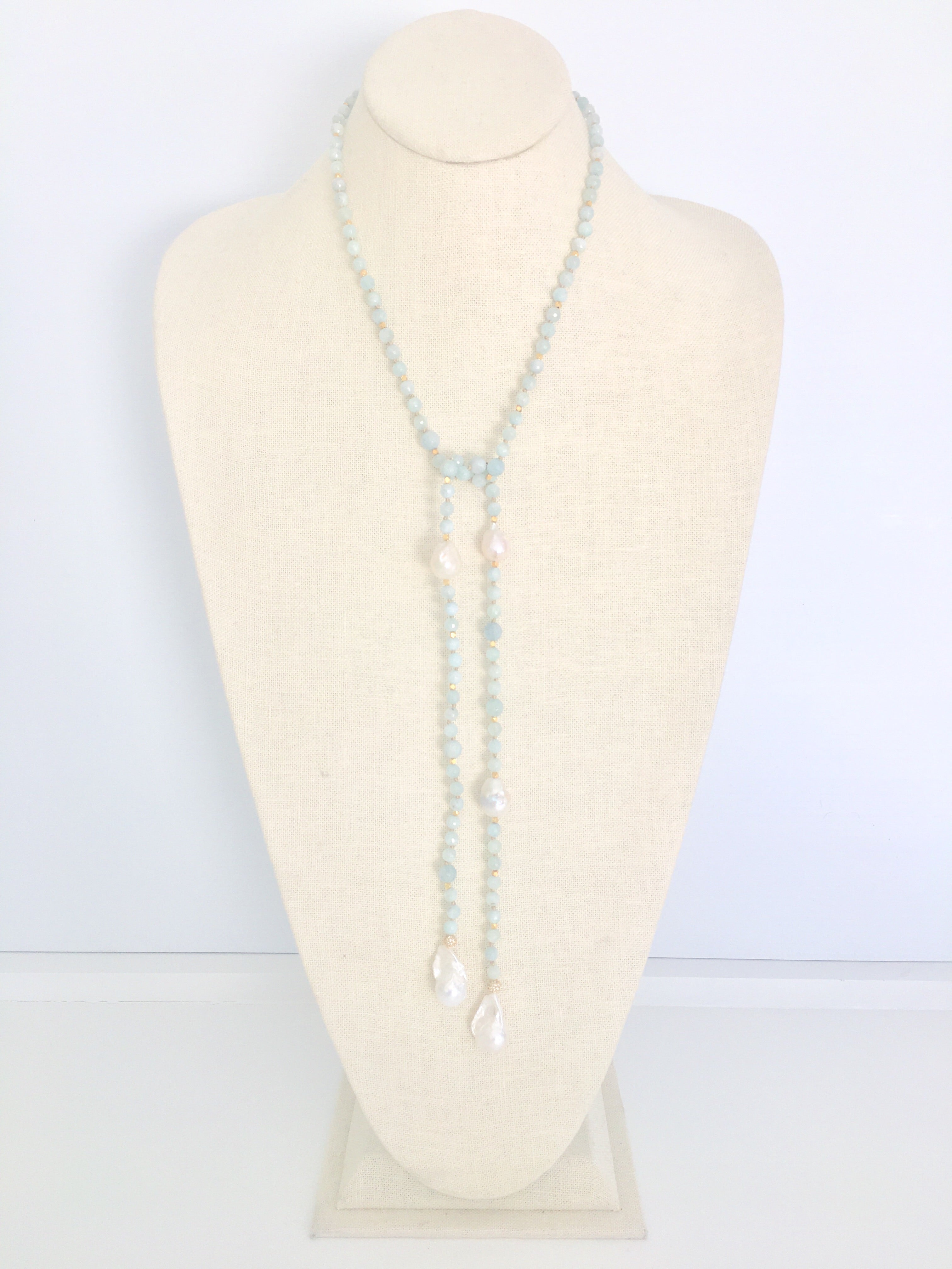 Wonderful stone lariat that showcases semi precious stones and pearls in a very flattering way.