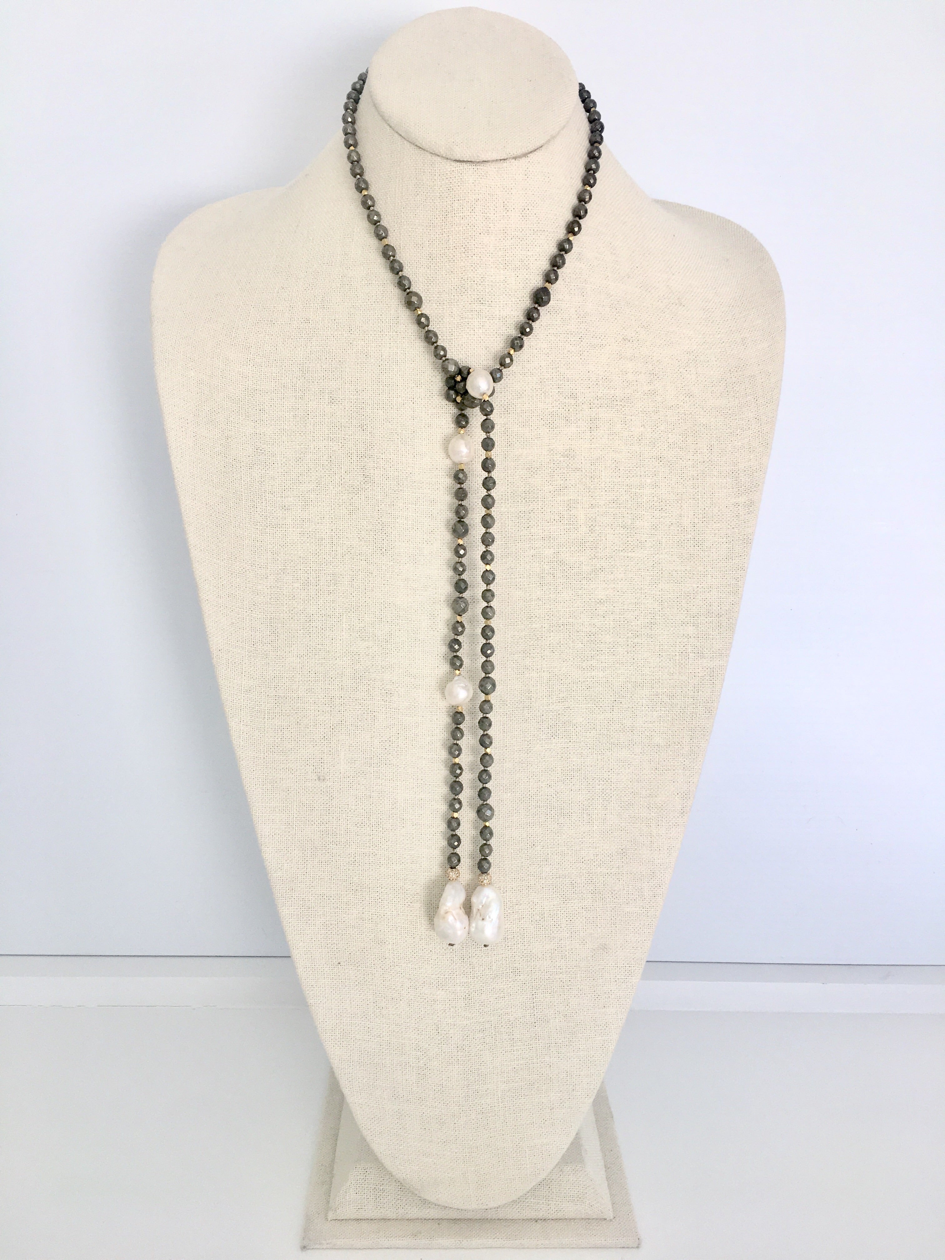 Wonderful stone lariat that showcases semi precious stones and pearls in a very flattering way.
