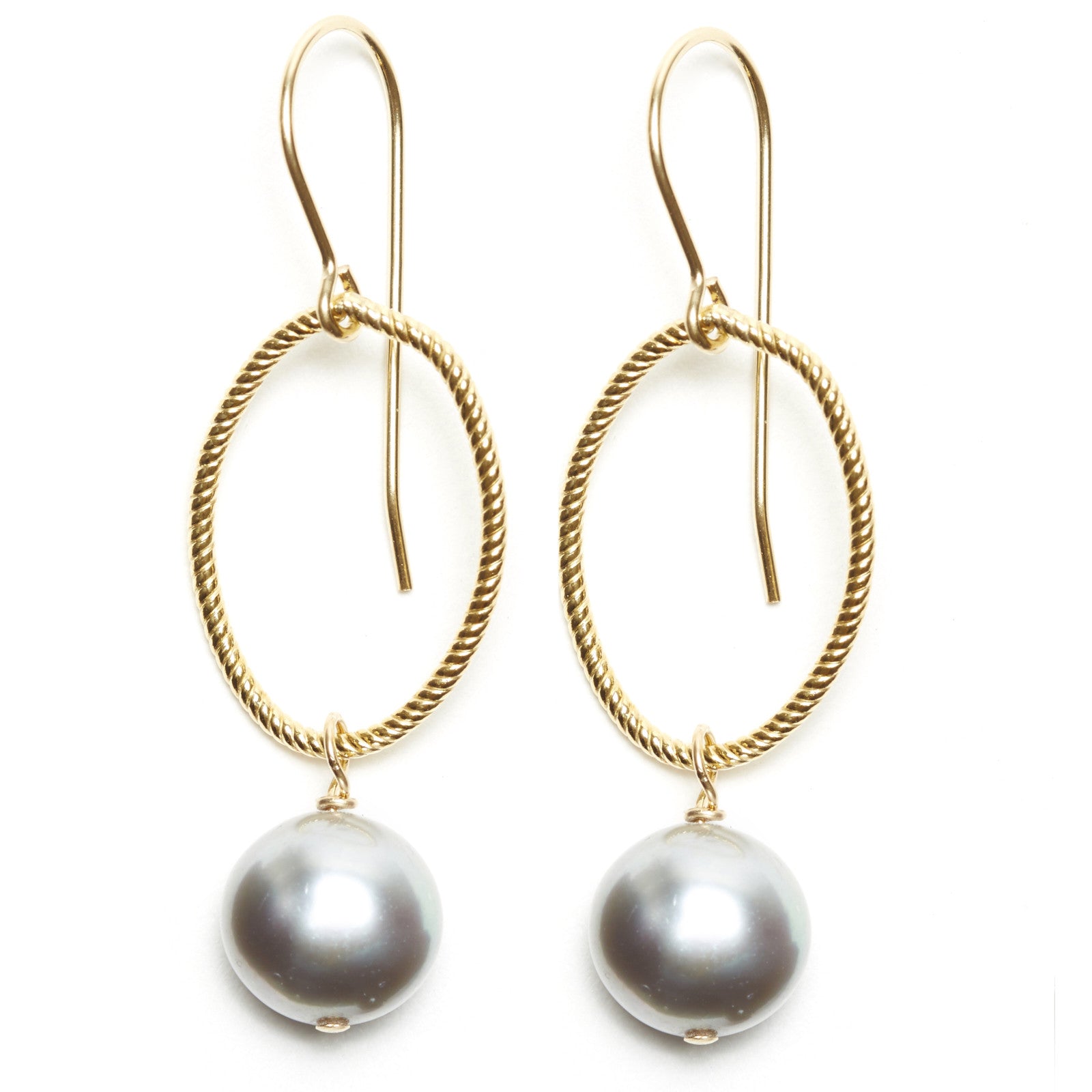 gold fill metal, grey pearl. Drop length 1 1/2".
