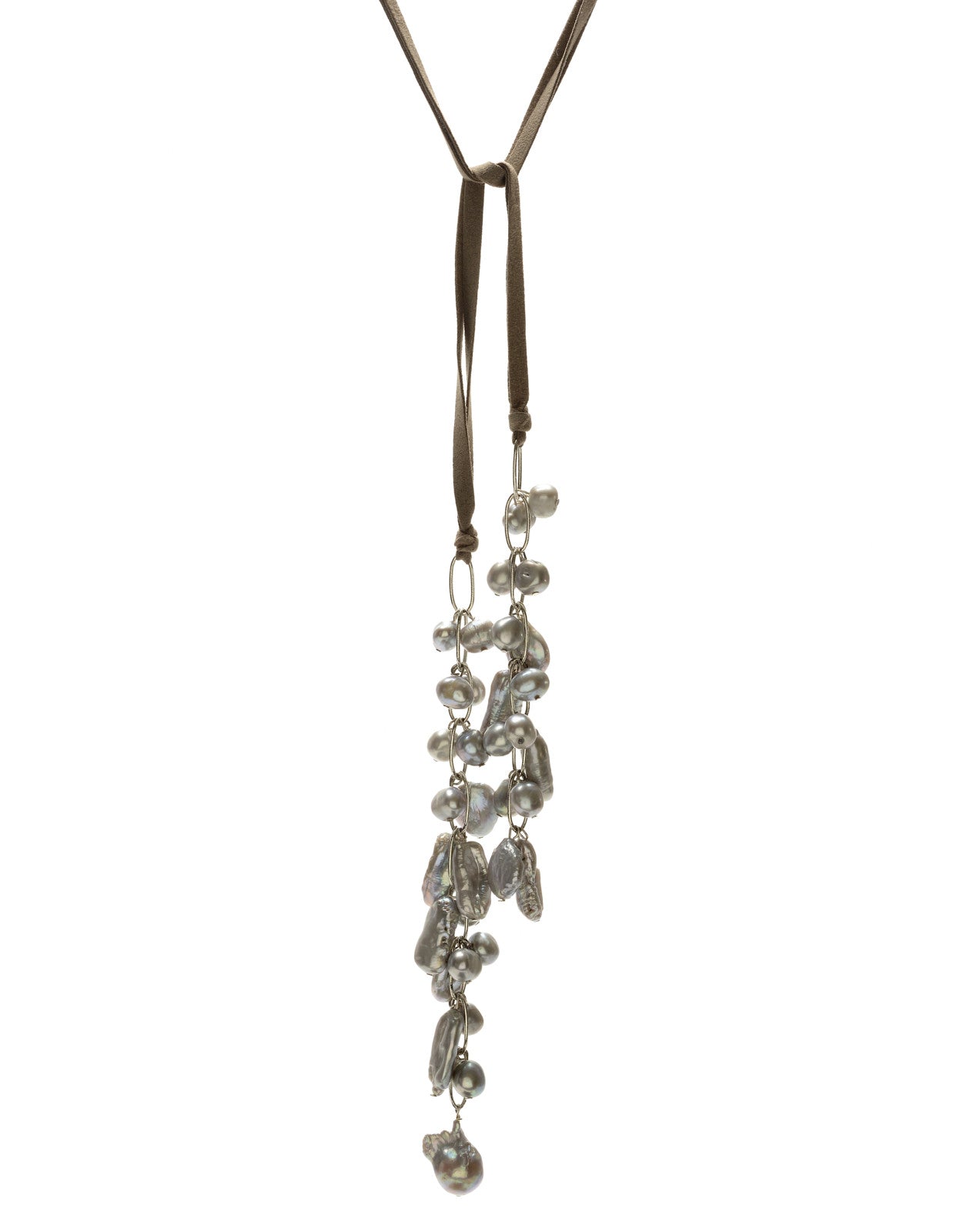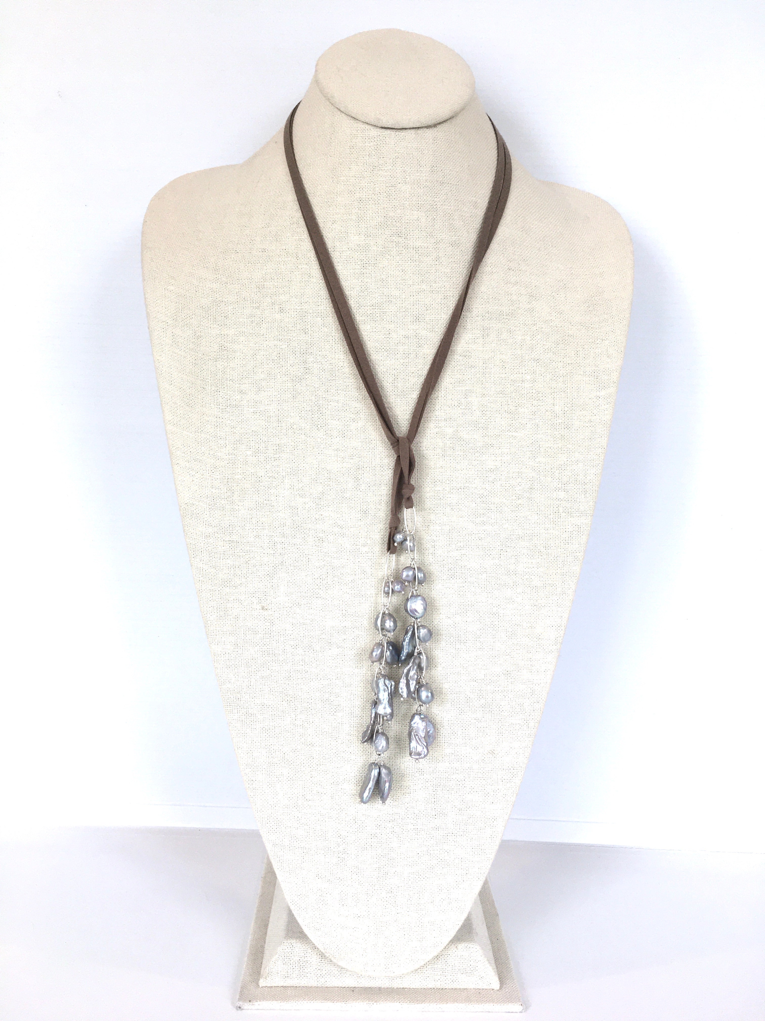 Grey pearls on white brass chain with taupe Japanese ultra suede cord