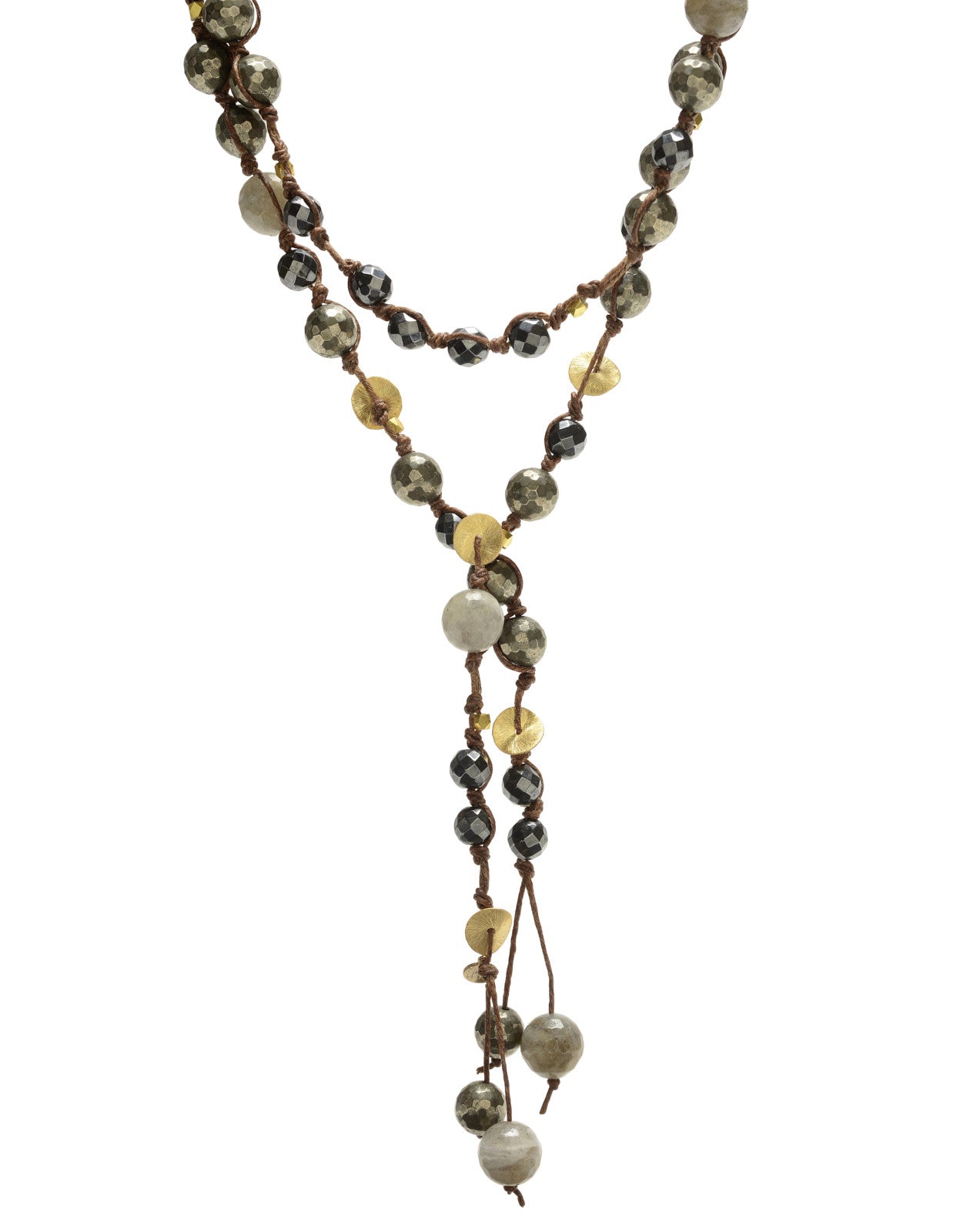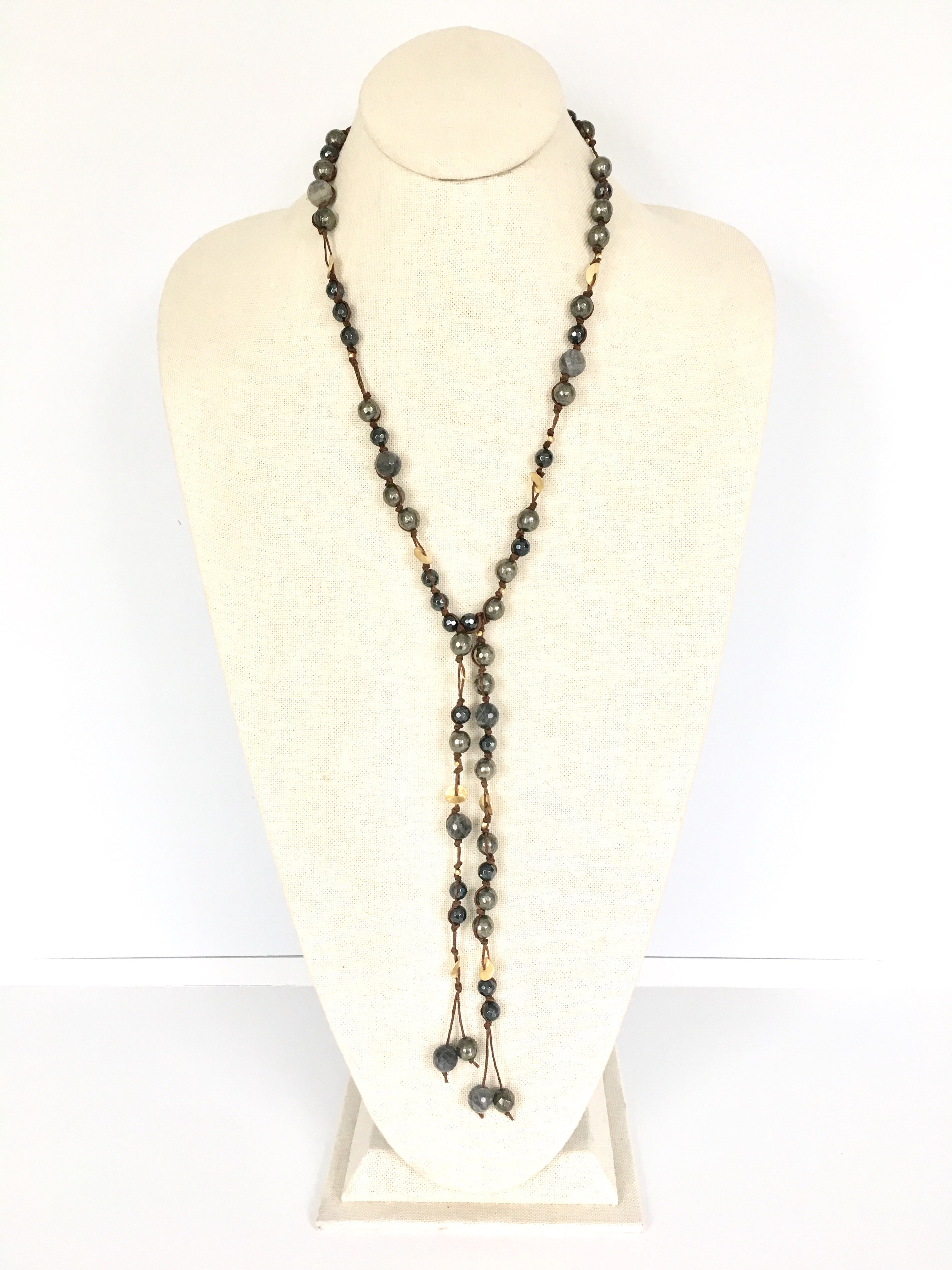 Beautiful long lariat with different sized round beads strung on Irish waxed linen with silver plated discs and nuggets.
