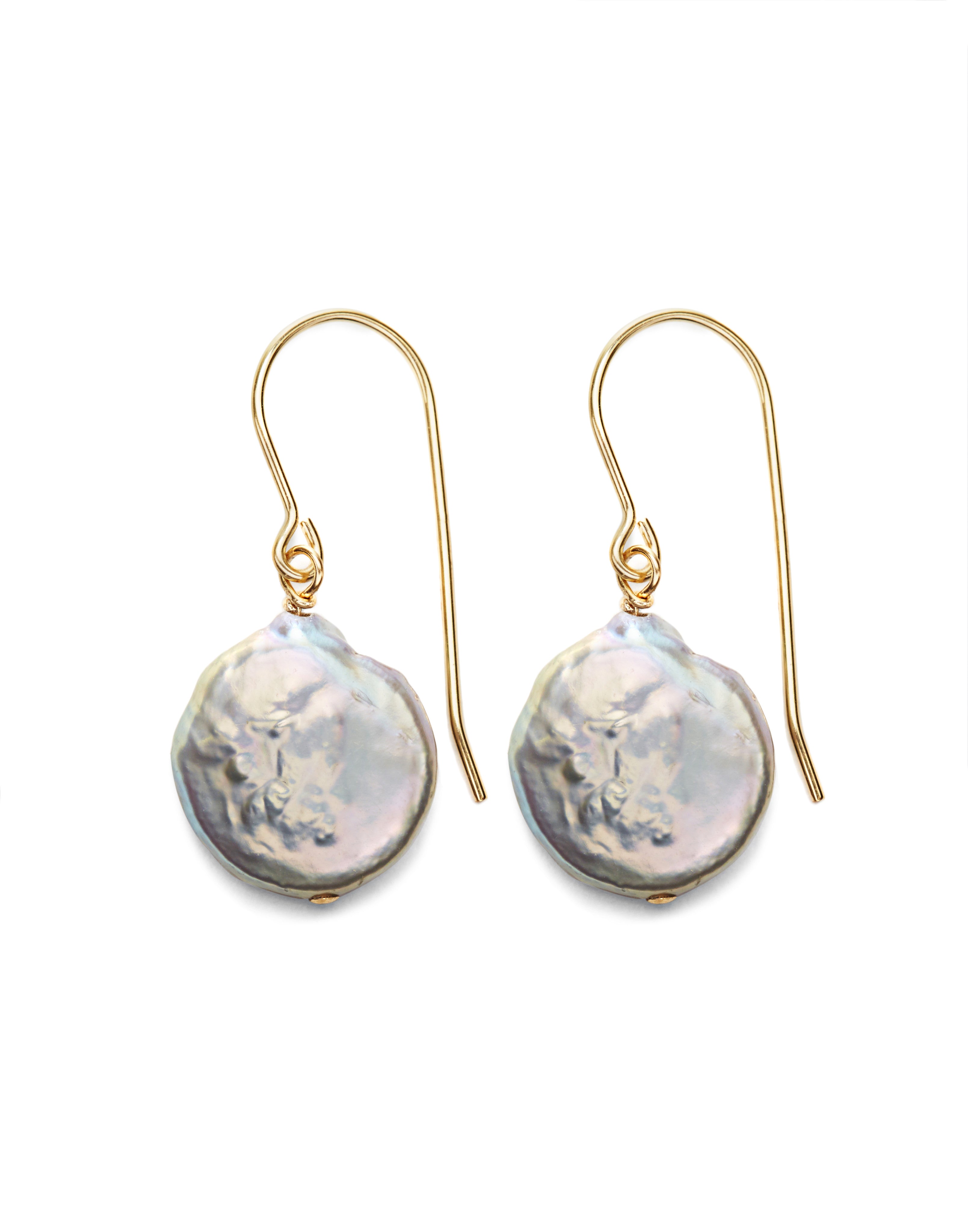 Coin pearl earrings in grey on a gold fill wire. Approximate diameter of pearl is 1/2".