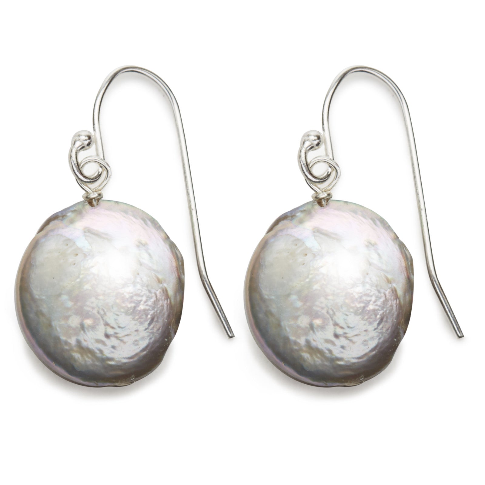 Coin pearl earrings in grey on a sterling silver ear wire. Approximate diameter of pearl is 1/2".