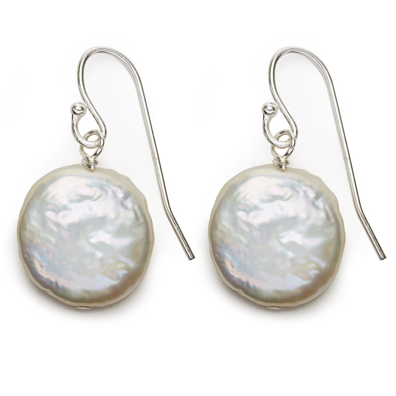 Coin pearl earrings in white on a sterling silver wire. Approximate diameter of pearl is 1/2".