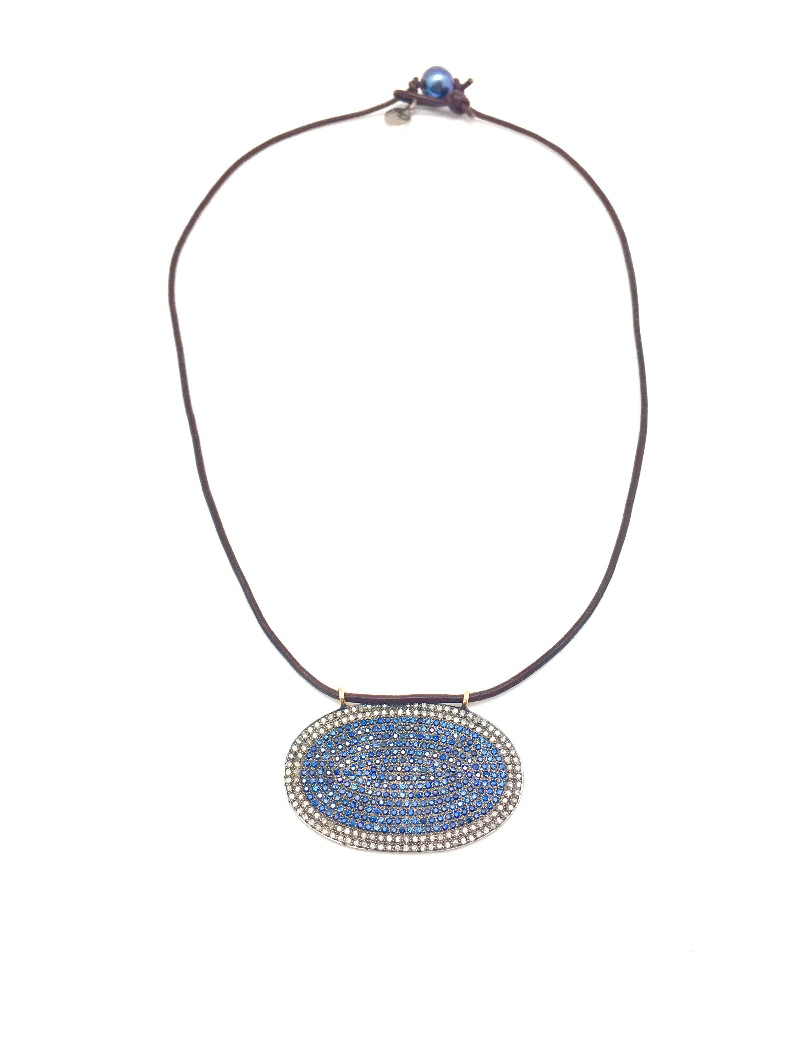 Pave diamonds and Saphires set in oxidized silver with gold plating on back. Size of oval is 35mm - 50mm
