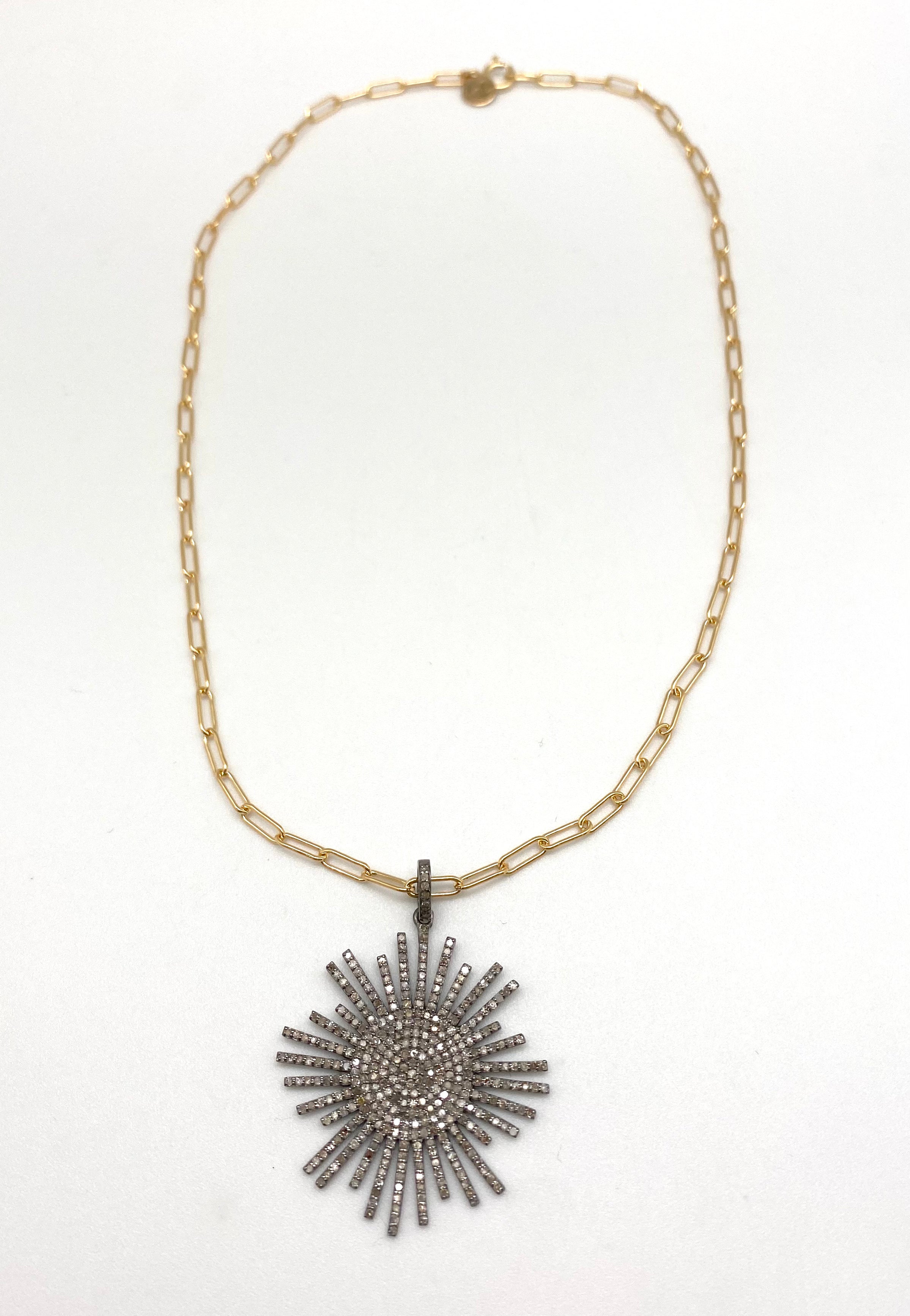 Diamond starburst pendant set in oxidized silver. Gold fill paper clip chain 17" long.