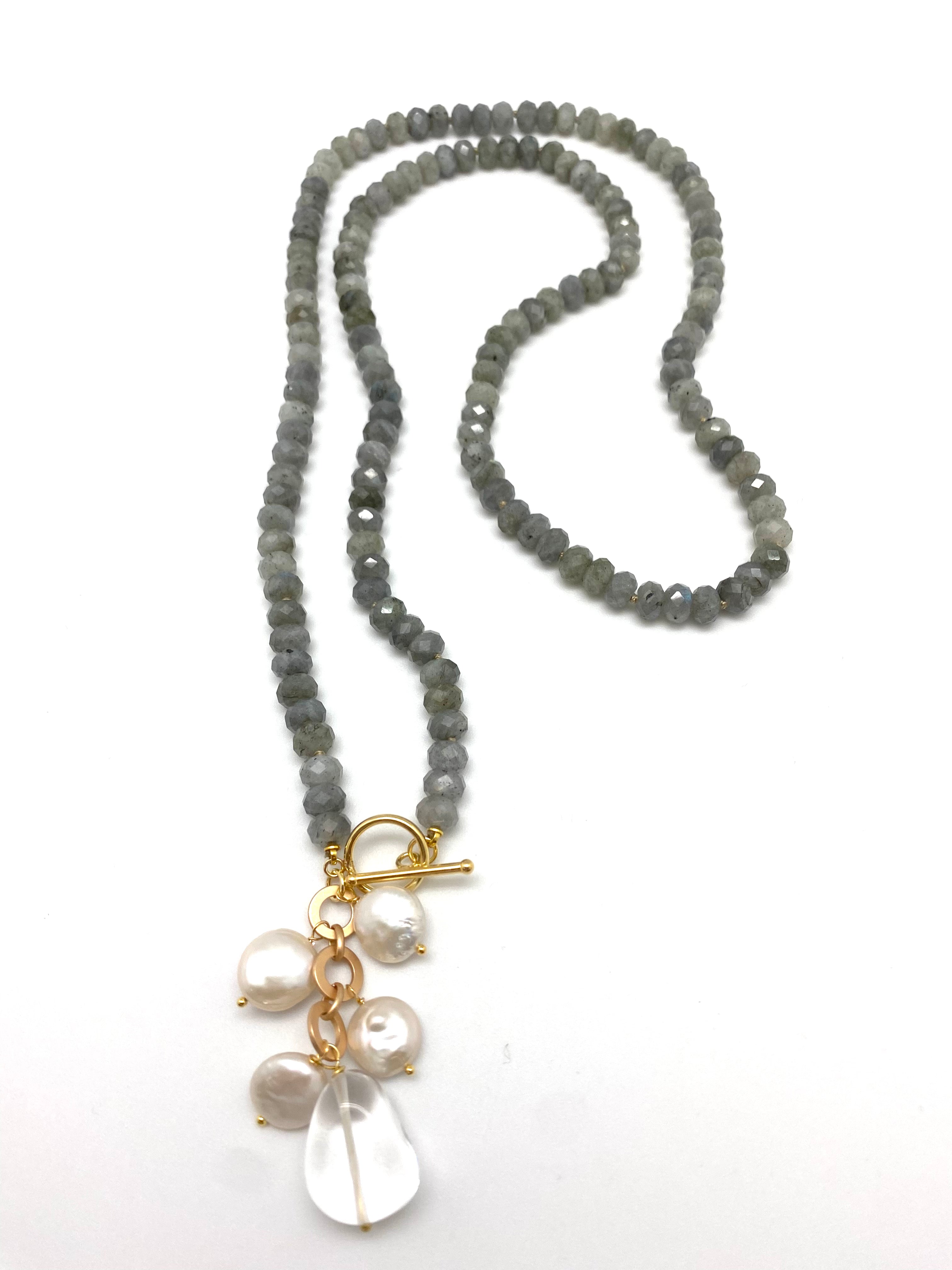 Labradorite and freshwater coin baroque pearls and a natural crystal
