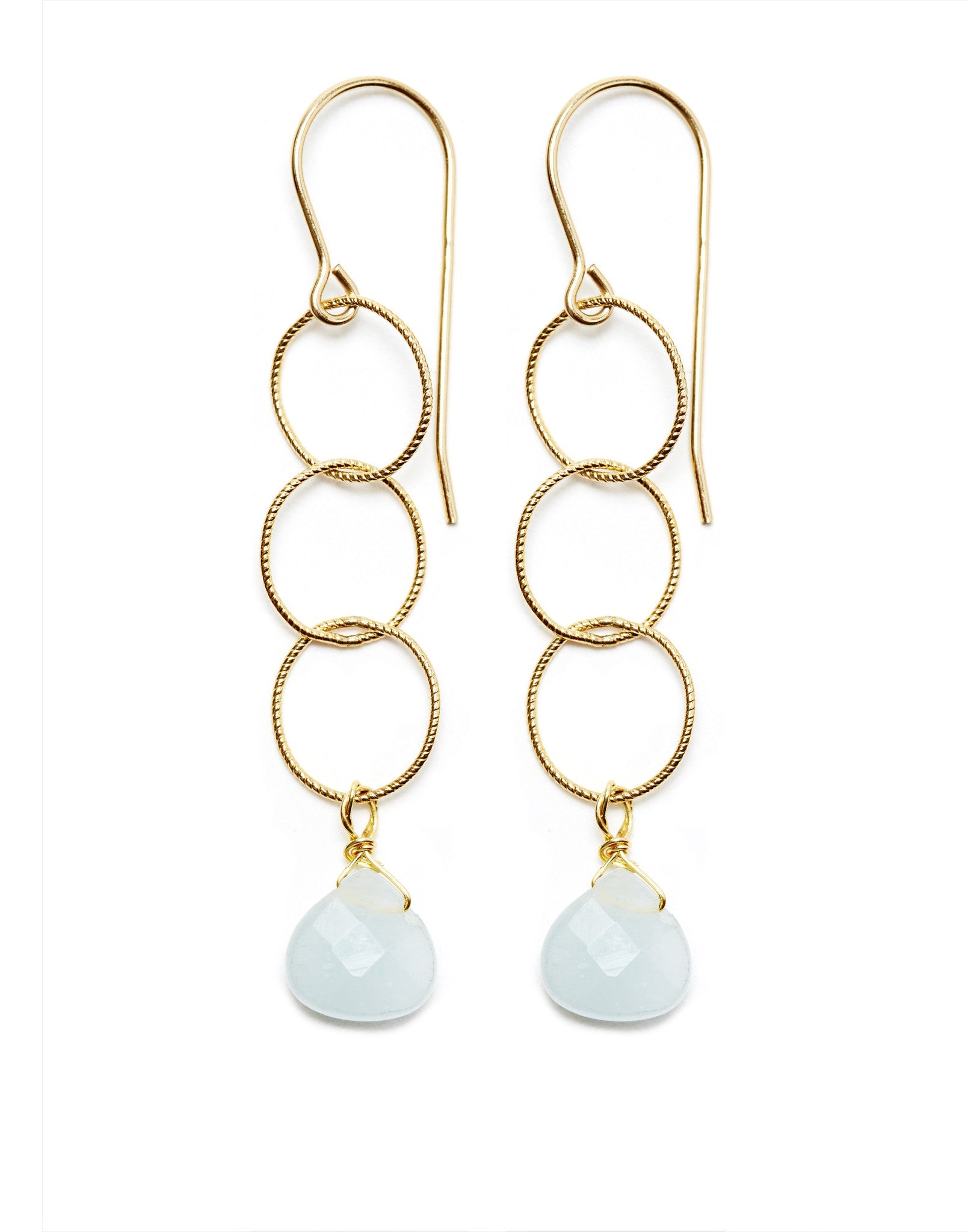 Three fine twisted gold fill circles with an aquamarine drop. Total drop 2".