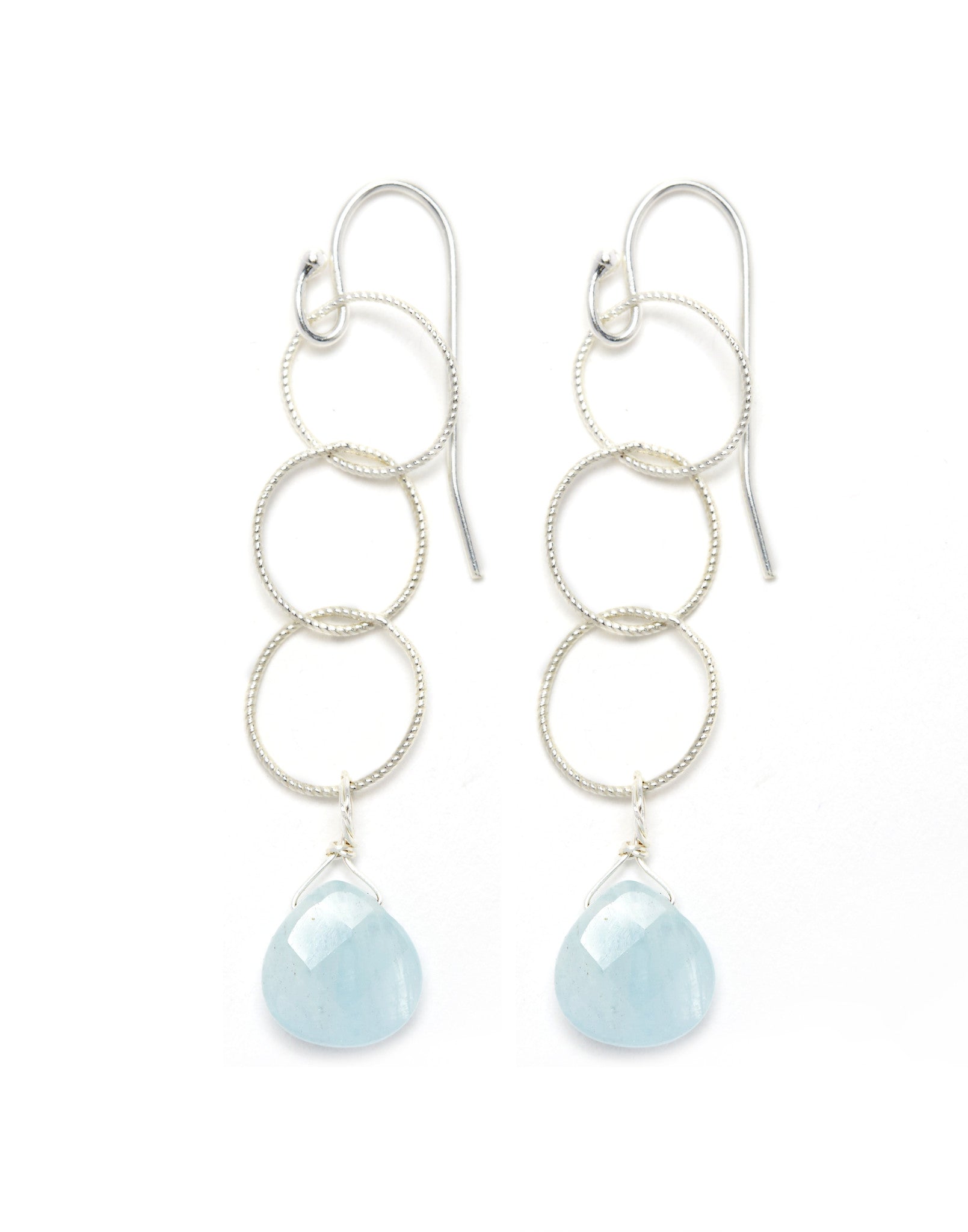 Three fine twisted sterling silver circles with an aquamarine drop. Total drop 2".