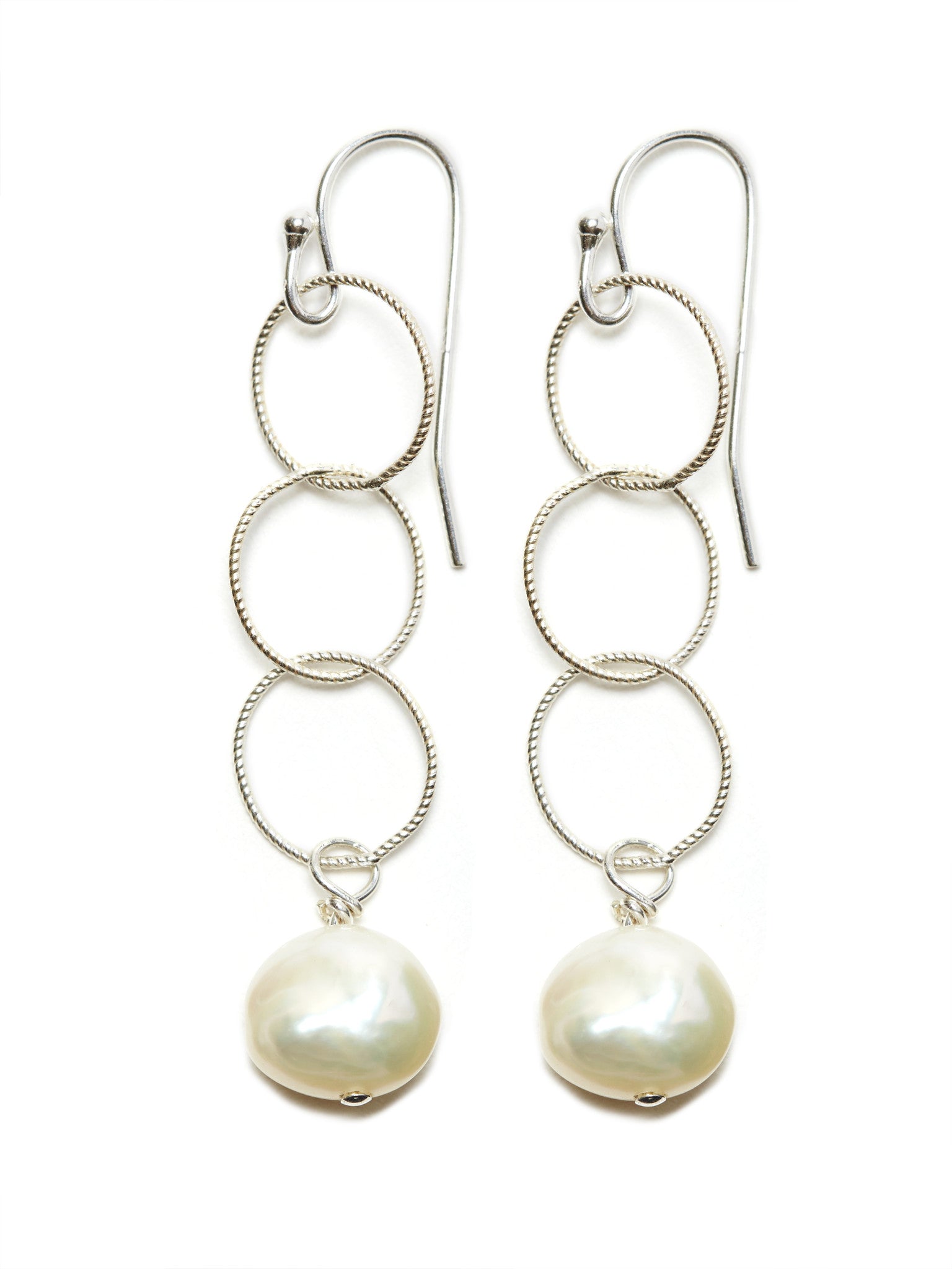 Three fine twisted sterling silver circles with a white pearl drop.Total drop 2".