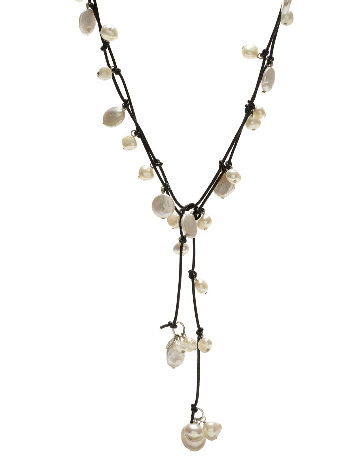 White freshwater coin and round pearls strung on black Greek leather cord attached with silver head pins.