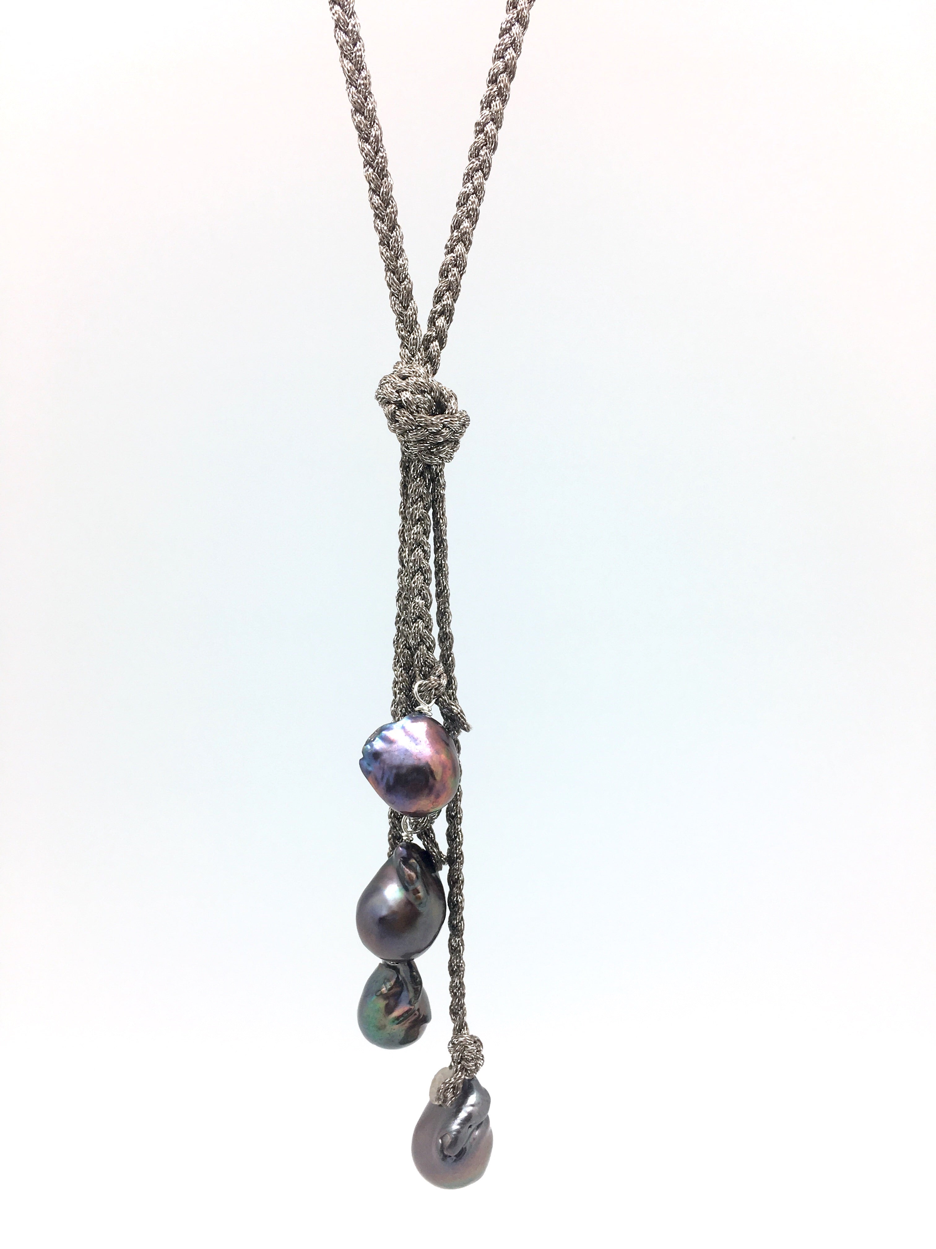 Metallic fabric cord from Japan. Oversized baroque pearls.
