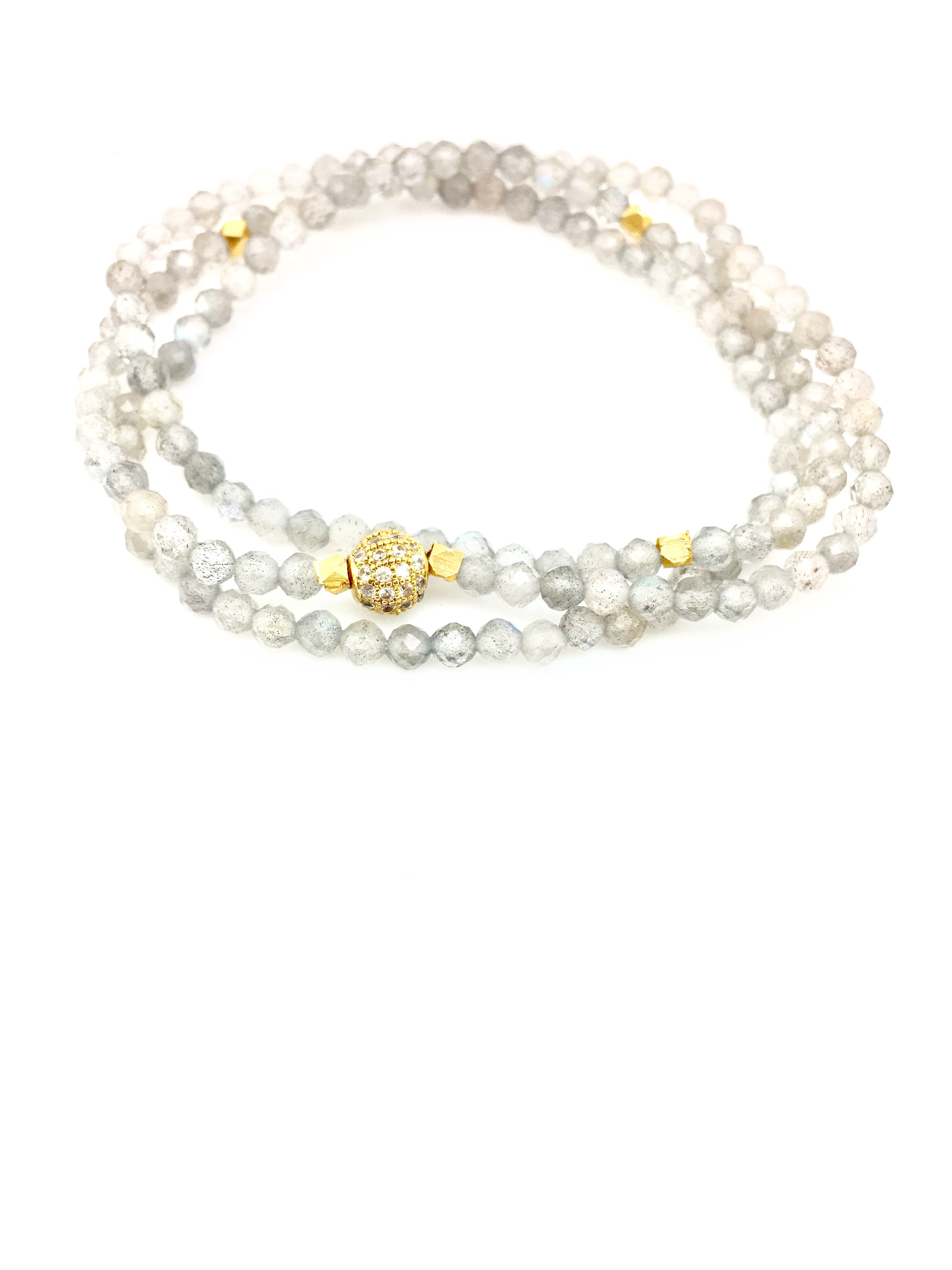 This dainty bracelet wraps three times around your wrist. Strung on a strong stretchy cord.