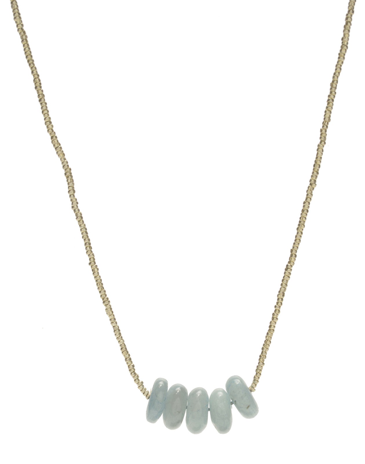 African heishi beads surround 5 stacked aquamarine barrels. Great go to piece.