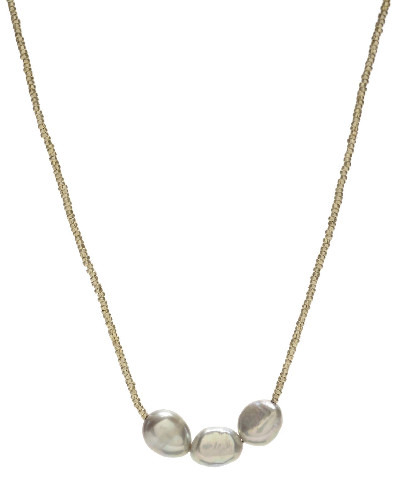 African heishi beads surround 3 light grey pearls. Great go to piece.