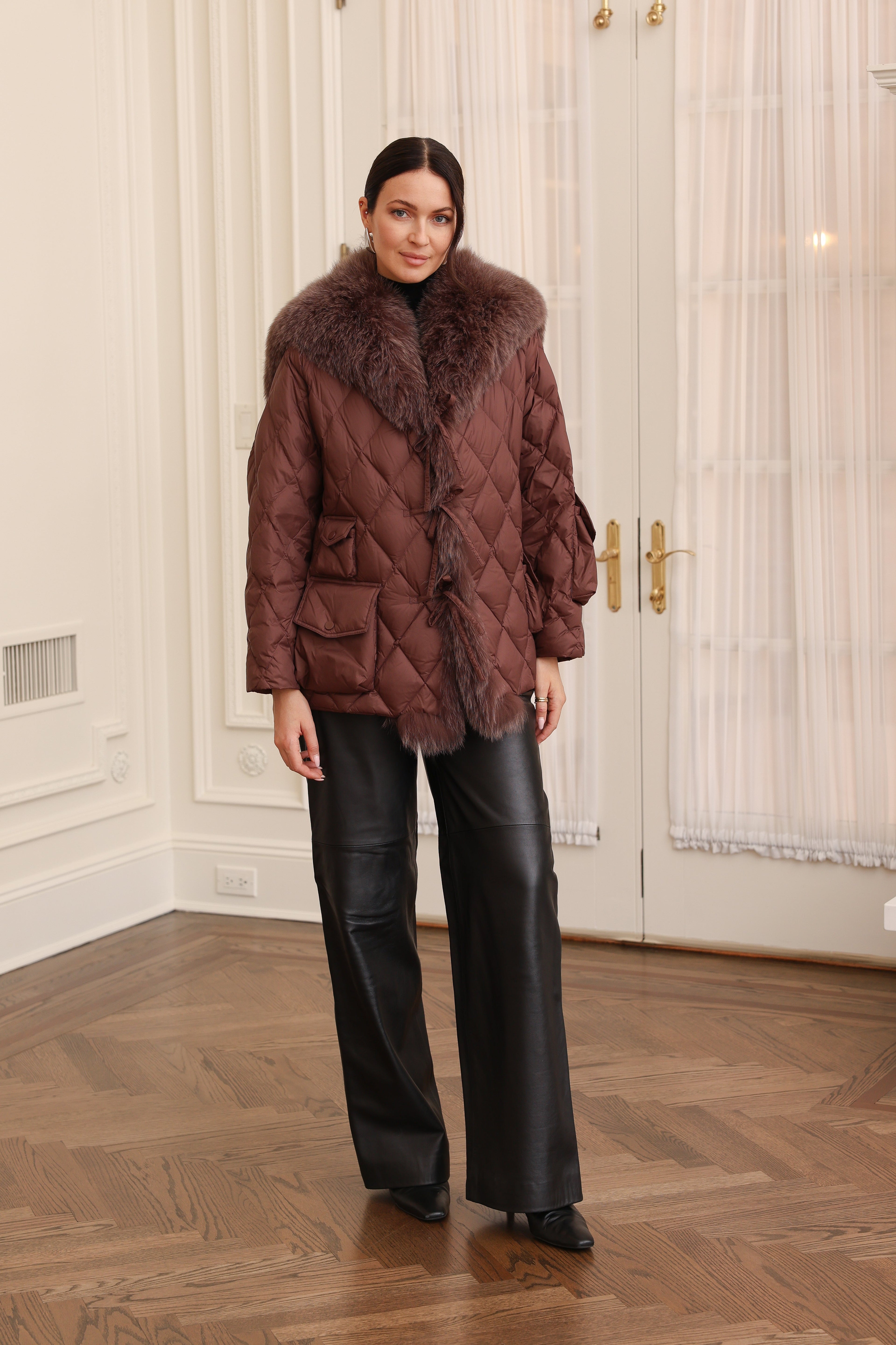 An elegant sailor-inspired jacket combines all-weather protection with a down jacket crafted from matte technical fabric, featuring a wealth of clever details. This jacket includes a fox fur sailor collar and fur trimming that runs down the front opening for added warmth. The design also features bow tie embellishments for a secure and stylish closure. Additionally, it has slip side pockets and patch pockets on the sleeves for extra flair.
