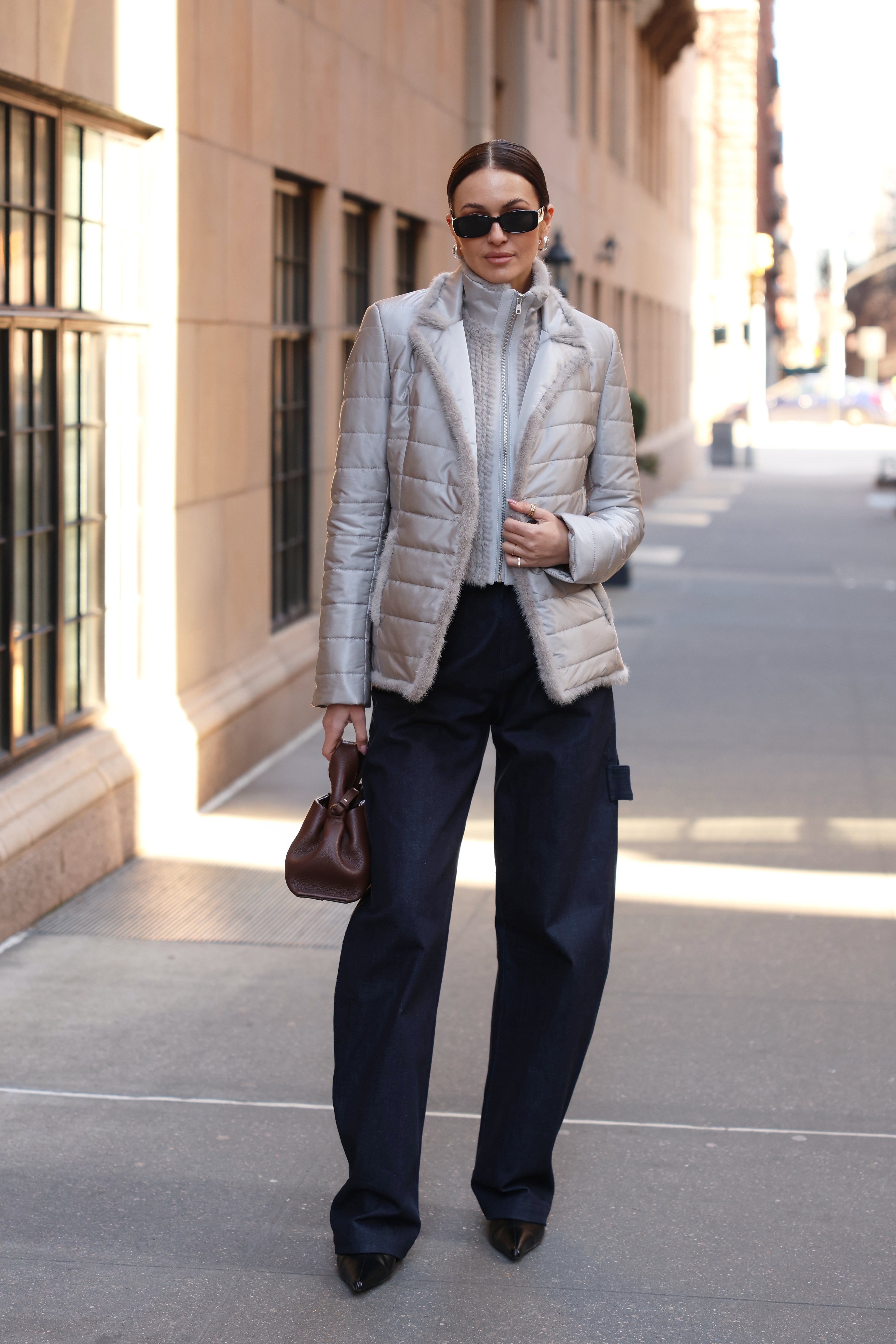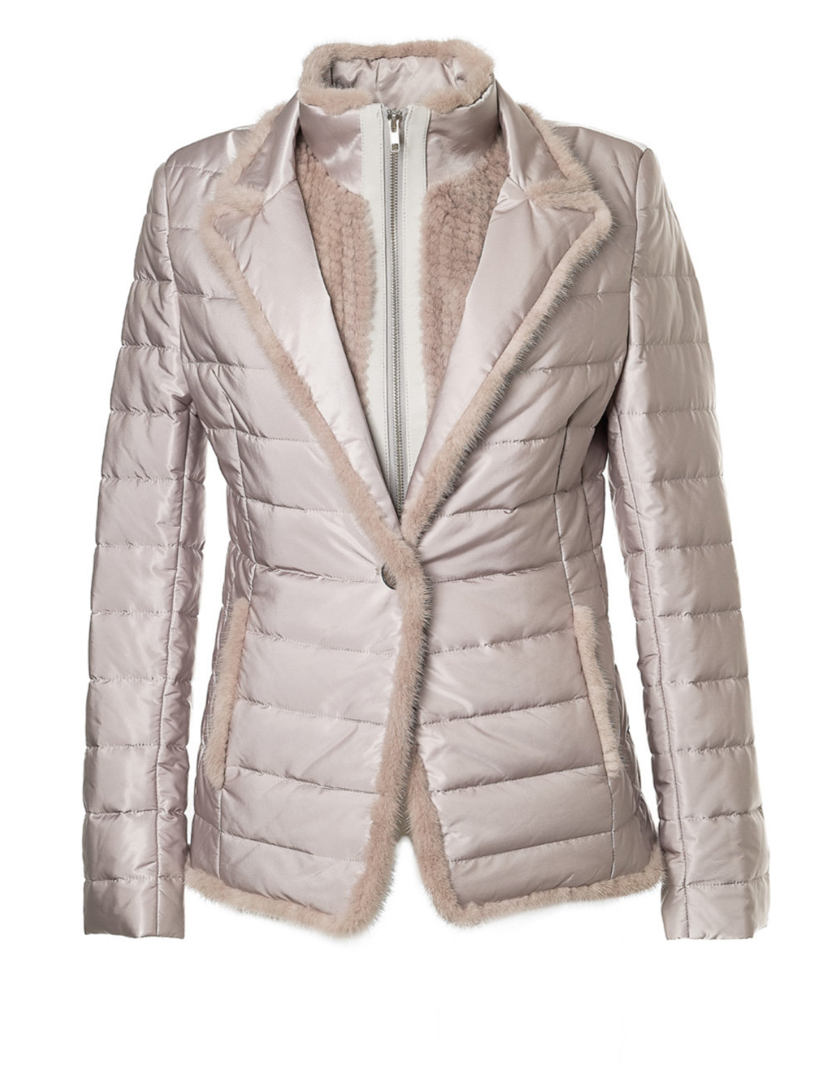 This classic mid-length jacket is made from waterproof nylon and features light padding in a slim-fit design. It has a lapel collar adorned with fur trimming and combines sleek lines with high performance. The jacket also includes a removable inner bodice that boasts luxurious, sustainable mink fur trim, which can be detached on warmer days.
